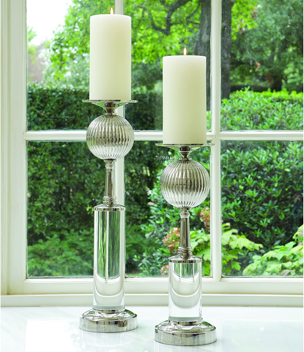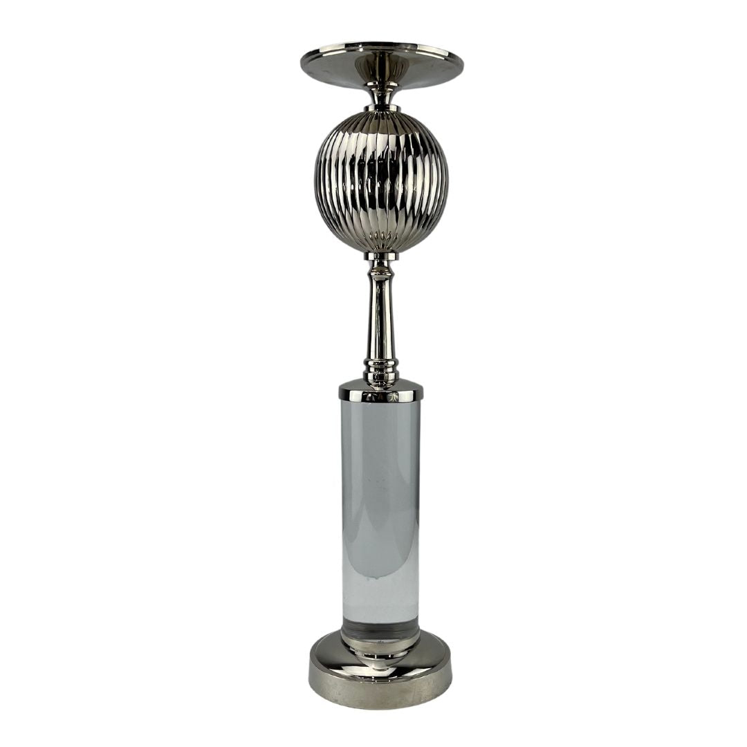 ADCA0099, CANDELABRO BAKARI NIQUELADO ALTO con diseño esférico acanalado y acabado en níquel pulido, ideal para añadir altura y sofisticación a arreglos decorativos, su presencia estilizada lo convierte en una pieza versátil para mesas, consolas o composiciones en conjunto, no incluye velas, MEDIDAS 13.97 x 13.97 x 45.45 cm, el color puede variar ligeramente de las fotografías