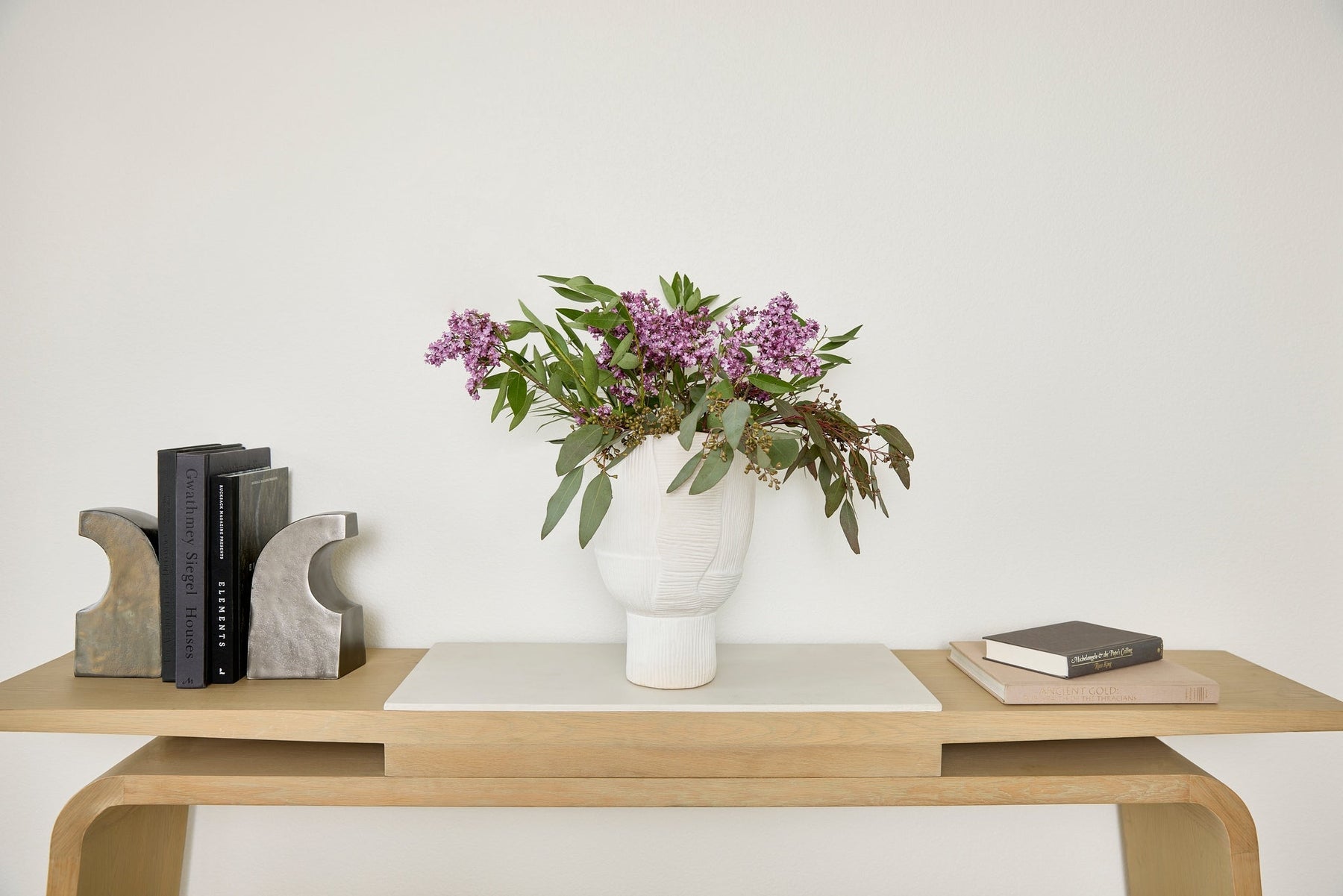 ADCM0220, ASTREAE, CENTRO DE MESA GRANDE es una pieza de cerámica de diseño escultural y orgánico. Este cuenco con pedestal se distingue por su acabado en blanco mate y una superficie ricamente texturizada con estrías verticales irregulares que evocan formas naturales como troncos o conchas. Su borde superior presenta un contorno ondulado y asimétrico, rompiendo con la rigidez geométrica. La base de pedestal eleva el cuerpo principal, otorgándole elegancia y presencia vertical. Es ideal para exhibir arreglos florales sueltos o simplemente como objeto de arte en consolas y mesas auxiliares. MEDIDAS 24.13 x 24.13 x 35.56 cm, el color y la textura pueden variar ligeramente de las fotografías.