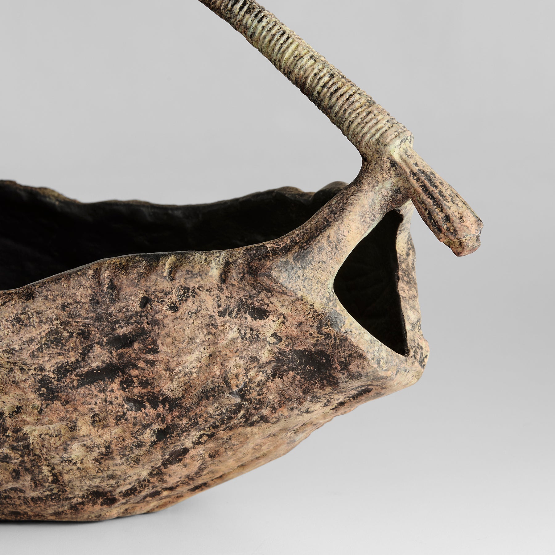 ADCM0229, HOBBIT, CENTRO DE MESA CANASTA GRANDE es la versión de mayor tamaño de la colección, ofreciendo una presencia más sustancial como pieza central. Fabricada en hierro resistente, mantiene el acabado característico "Antique Ochre" (ocre envejecido) que simula una oxidación natural y aporta calidez rústica. Su diseño de canasta abierta con asas laterales integradas y estructura de varillas curvas permite una visibilidad total de su contenido, haciéndola perfecta para exhibir arreglos voluminosos, frutas o colecciones de objetos decorativos en mesas de comedor amplias o islas de cocina. MEDIDAS 52.07 x 20.32 x 25.40 cm.