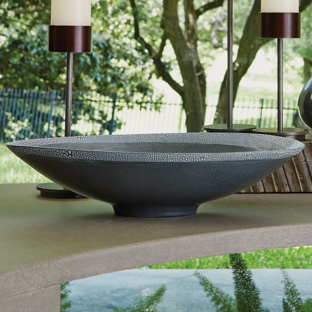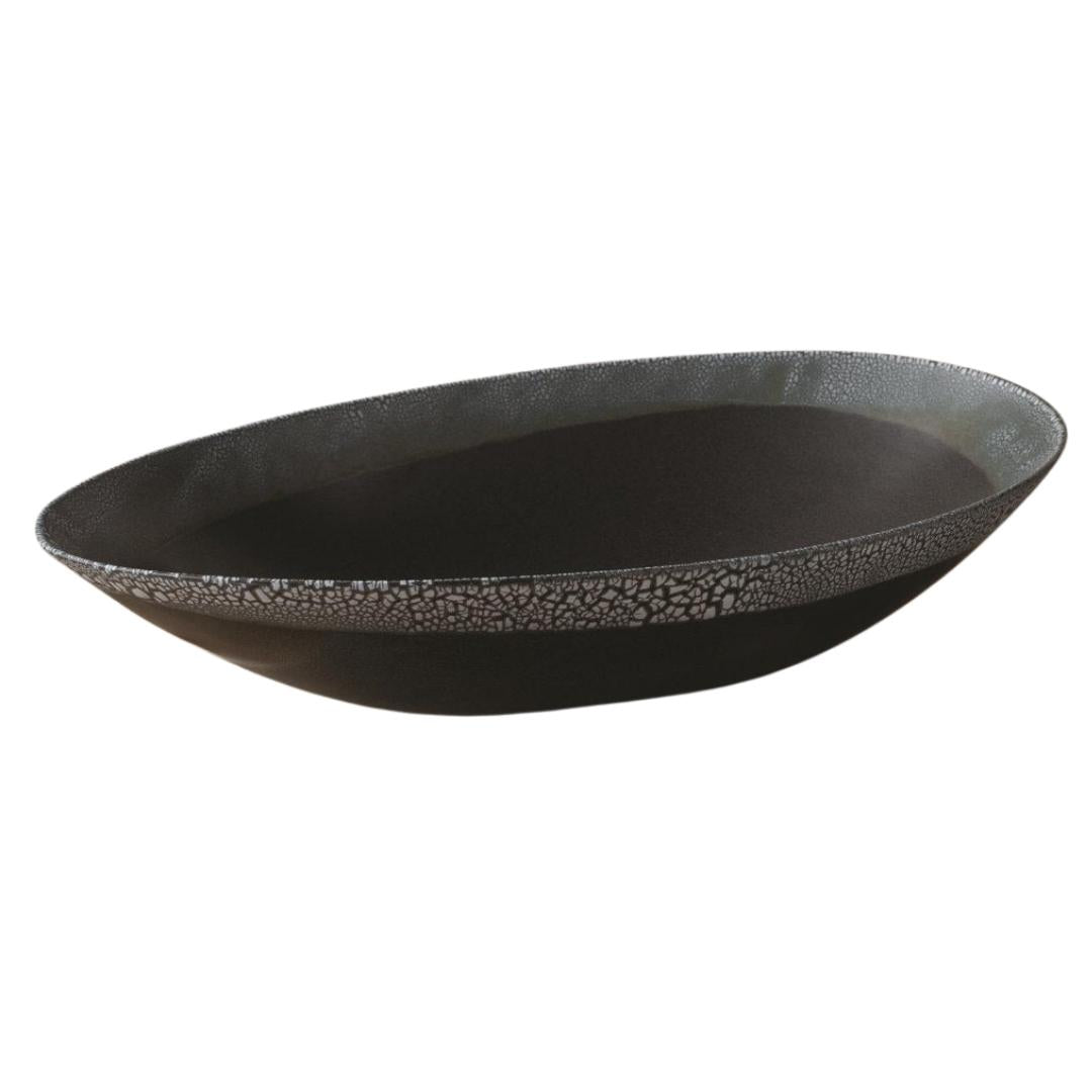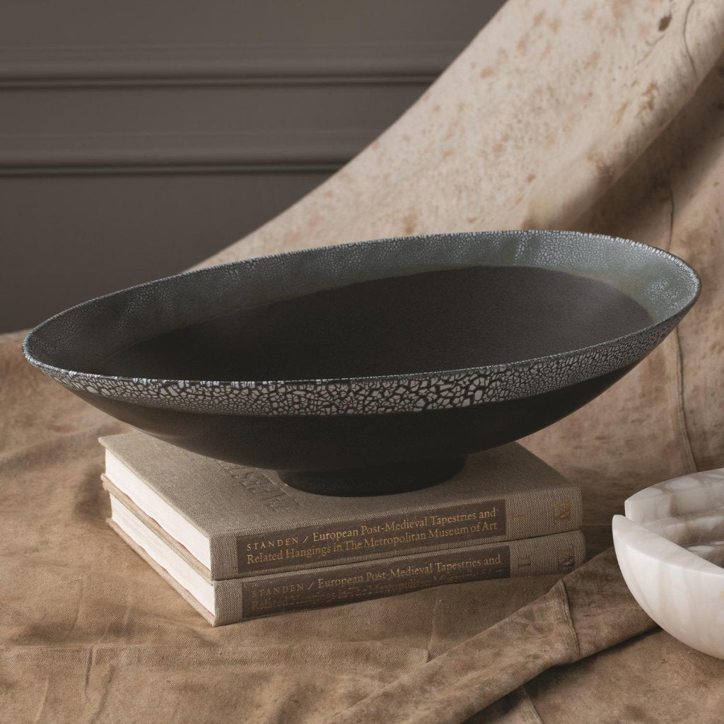 ADCM0144, CENTRO DE MESA OVALADO ELEVATION elaborado por artesanos cerámicos portugueses, técnica de esmalte que simula cáscara de huevo combinada con esmalte reactivo, diseño decorativo único con presencia artesanal refinada, ideal como pieza central en espacios contemporáneos, MEDIDAS 53.34 x 33.02 x 13.97 cm, el color puede variar ligeramente de las fotografías