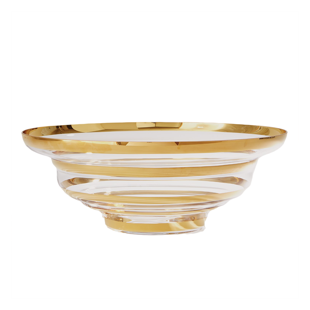ADCM0205, CENTRO DE MESA ITAI en cristal artístico escalonado hecho a mano con anillos de esmalte metálico dorado, diseño llamativo y elegante ideal como pieza decorativa principal, MEDIDAS 20.32 x 54.61 cm, el color puede variar ligeramente de las fotografías