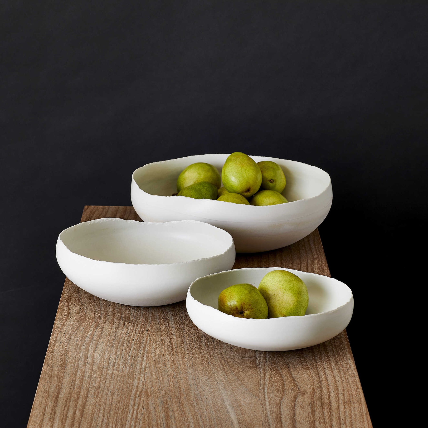 ADCM0212, CENTRO DE MESA LEO CHICO en porcelana con esmalte blanco reactivo y sutiles rastros de celadón claro, color que evoca cristal marino sobre arena blanca, diseño de borde orgánico ideal como pieza central o multiusos, MEDIDAS 25.4 x 10.16 x 25.4 cm, el color puede variar ligeramente de las fotografías