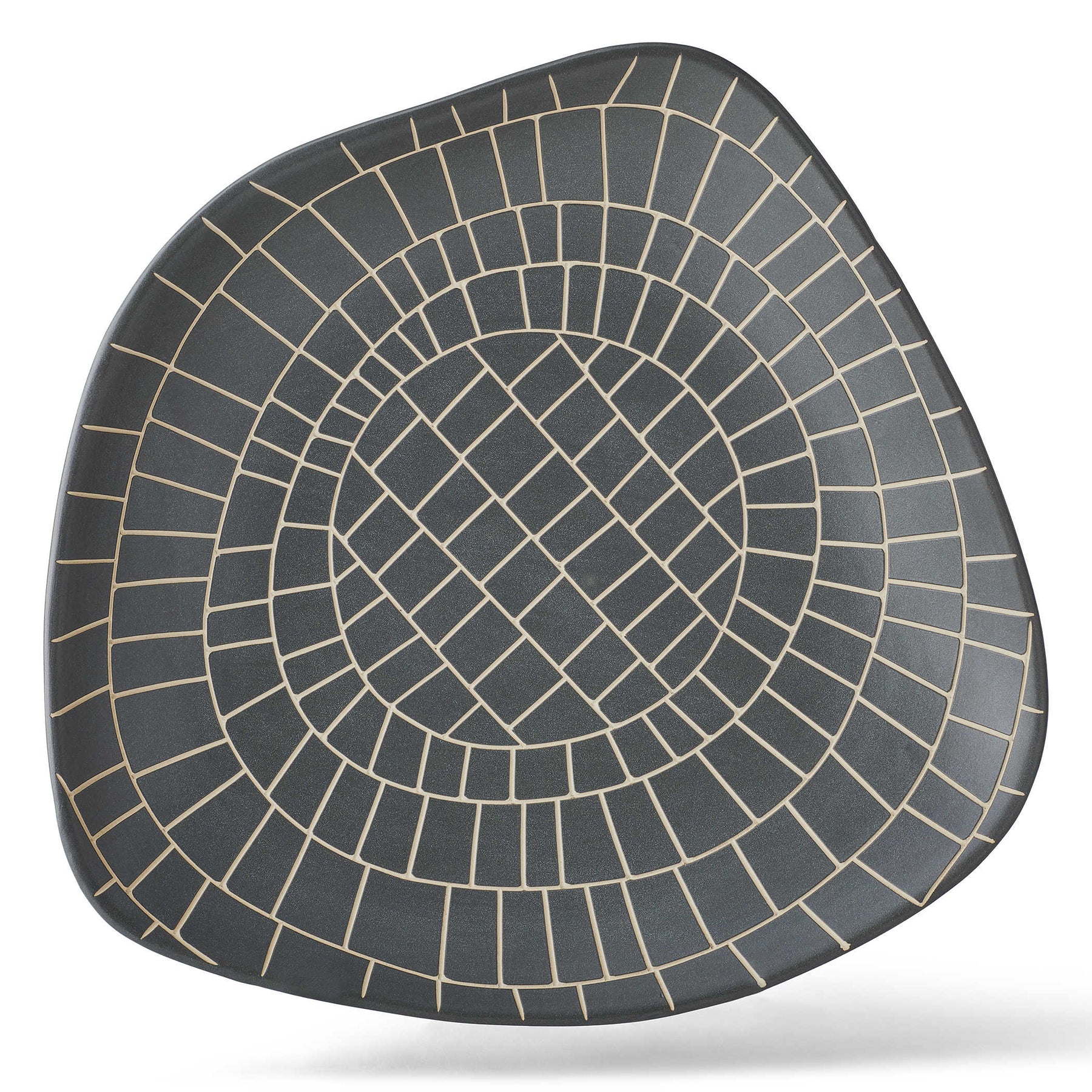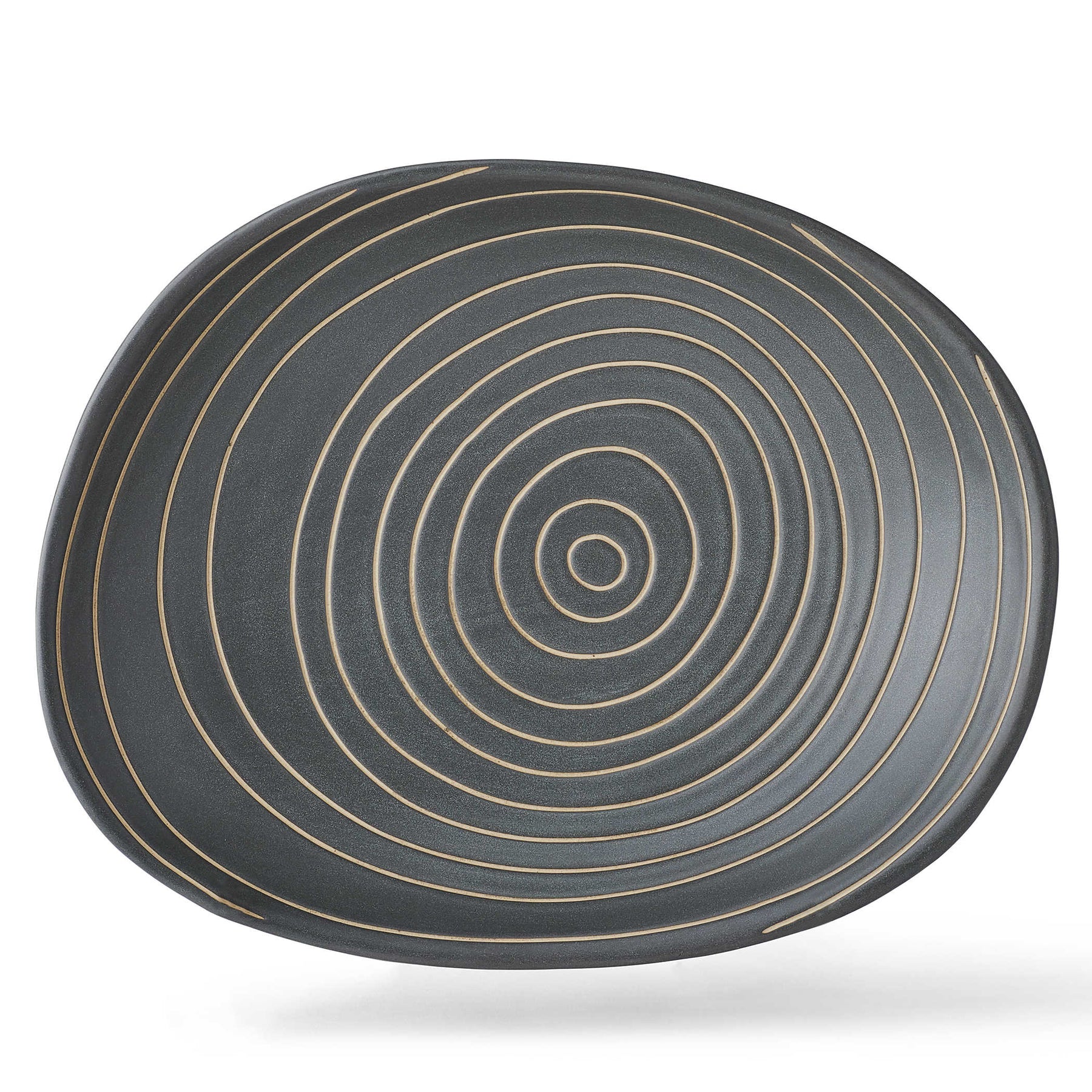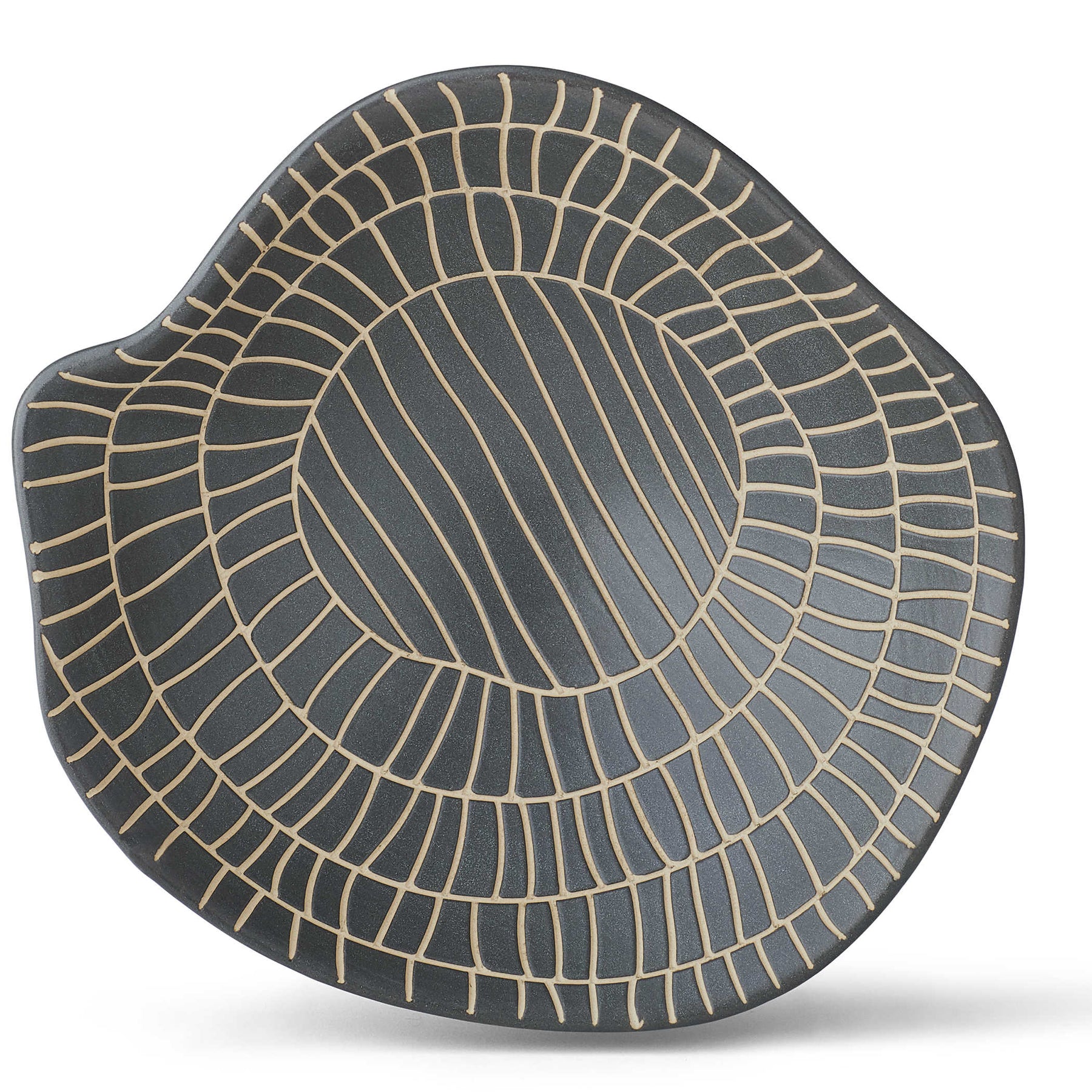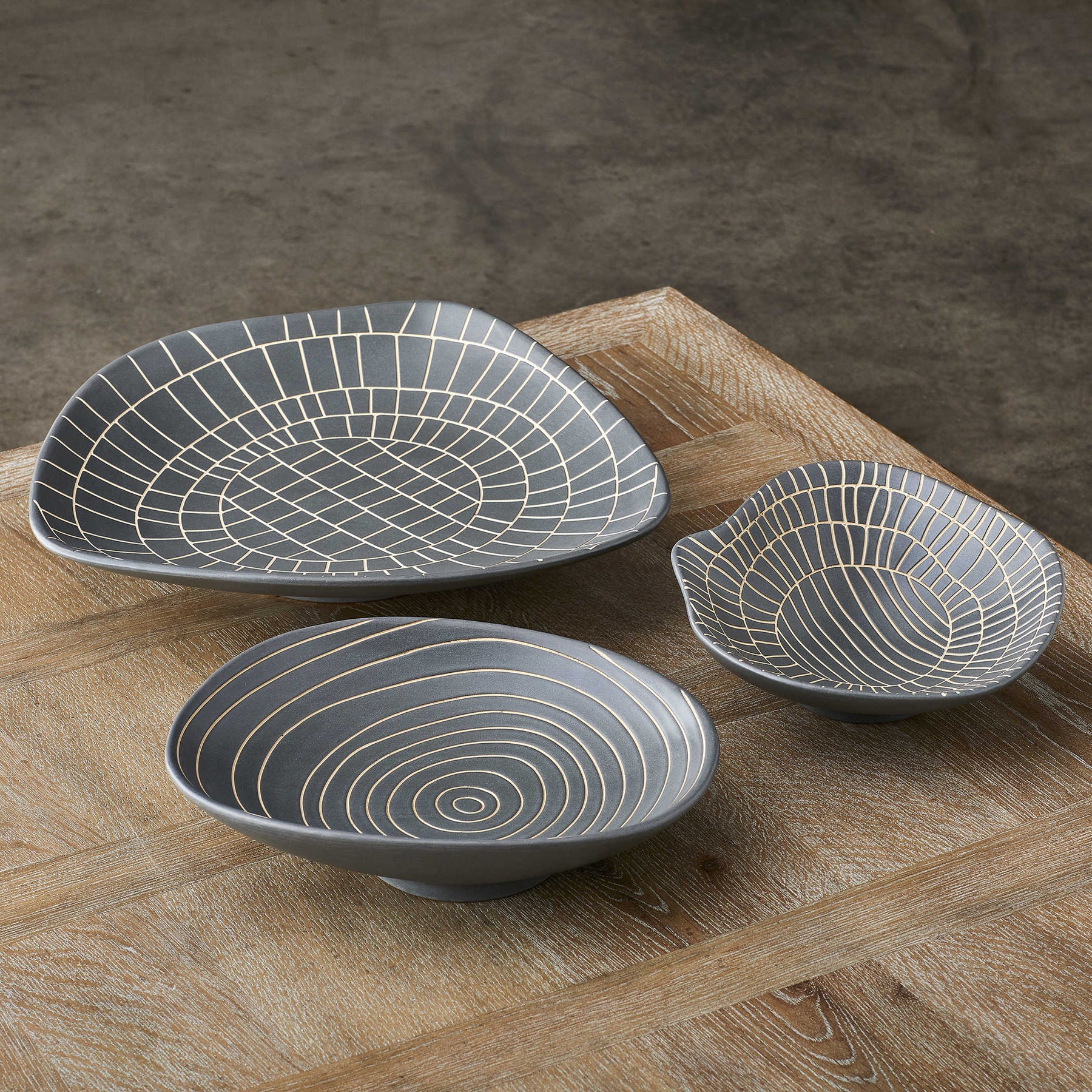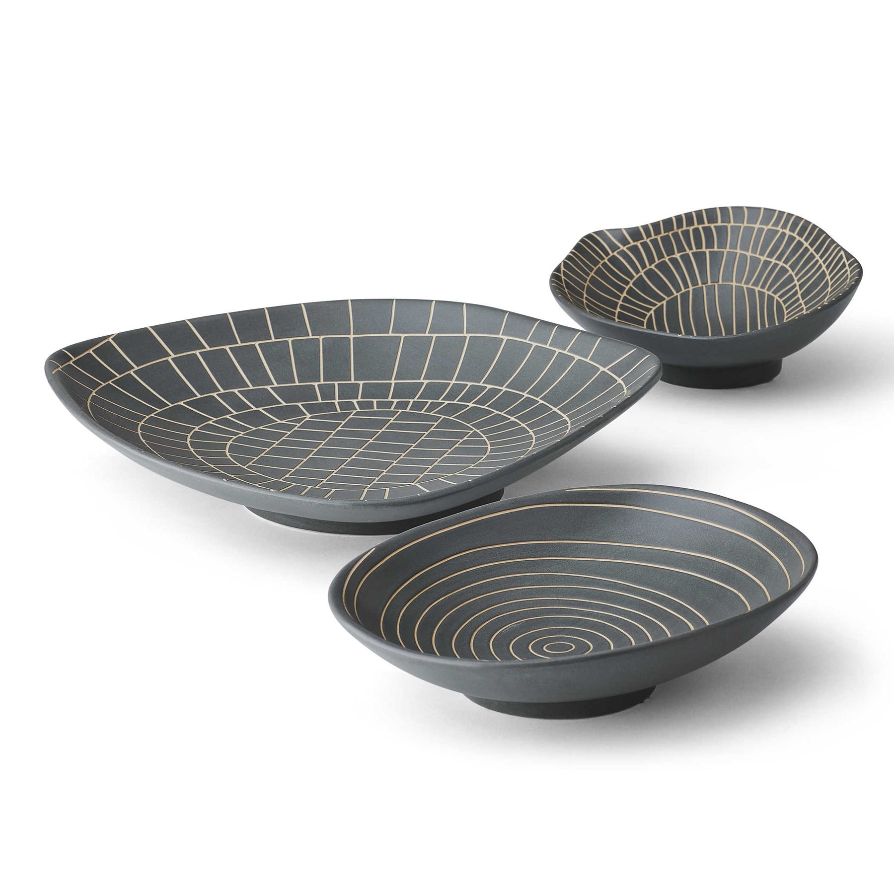 ADCM0203, CENTROS DE MESA PADEN en terracota con esmalte gris mate y diseño grabado a mano inspirado en jeroglíficos y mapas antiguos, formas orgánicas disponibles en tres tamaños para composición individual o grupal, MEDIDAS 22.86 x 22.86 x 10.16 cm / 30.48 x 27.94 x 7.62 cm / 40.64 x 40.64 x 10.16 cm, el color puede variar ligeramente de las fotografías