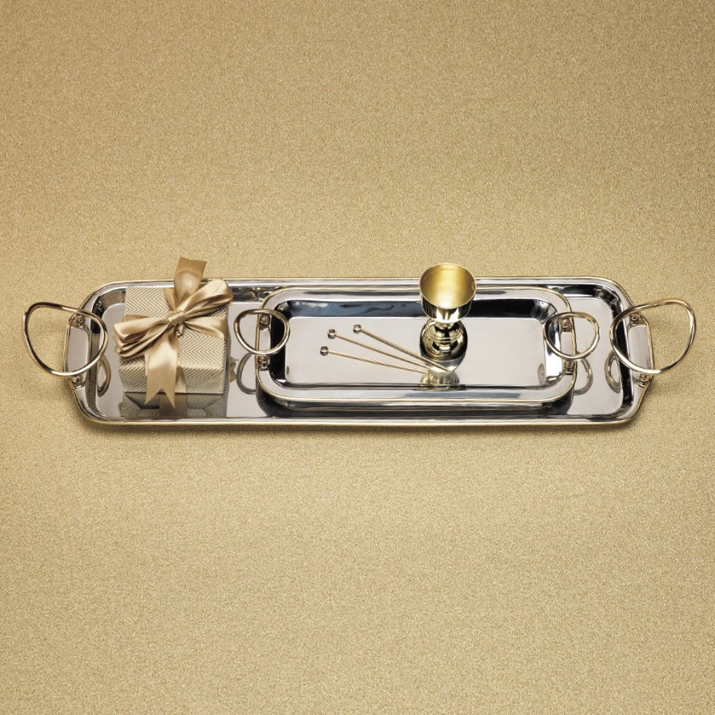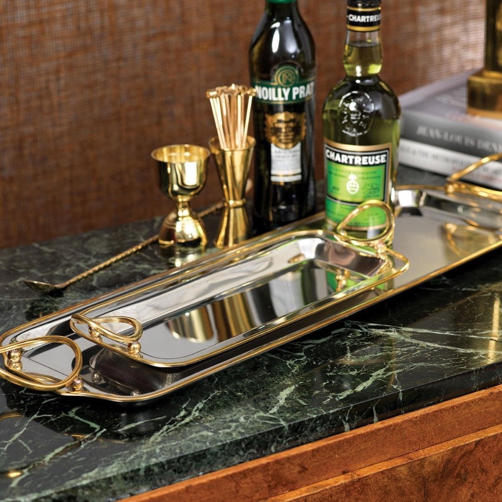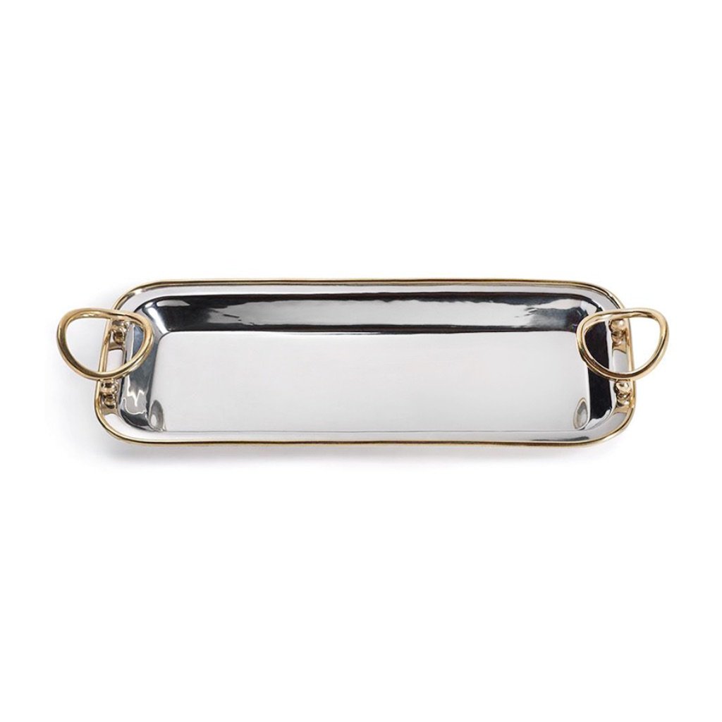 ADCH0068, CHAROLA KAROL elaborada en níquel pulido con cinta decorativa y asas en color dorado, diseño elegante que aporta sofisticación a espacios pequeños como repisas, tocadores o mesas auxiliares, MEDIDAS 29.21 x 12.7 x 5.08 cm, el color puede variar ligeramente de las fotografías