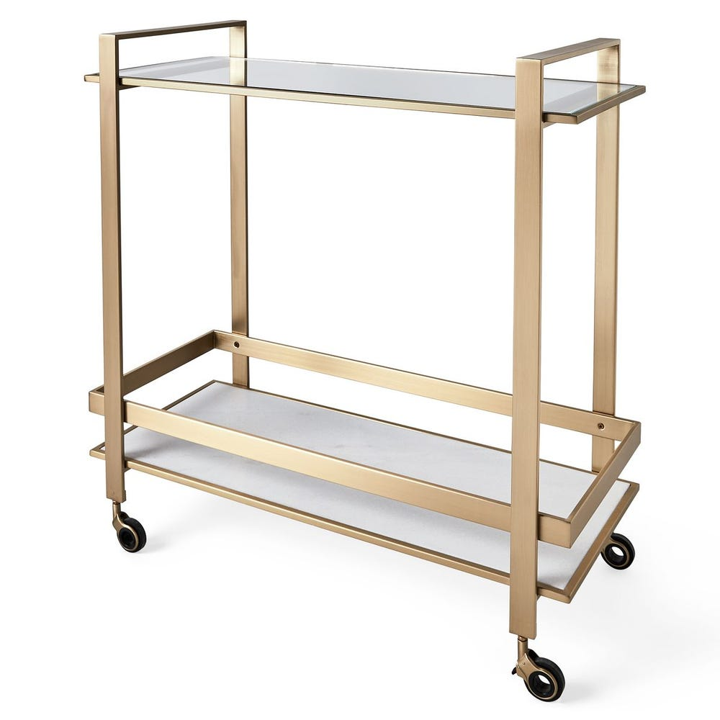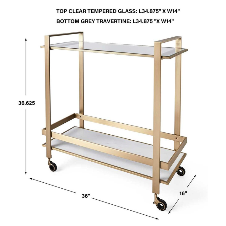 CMBA0005, BALANCE, CARRITO DE BAR es una pieza de mobiliario auxiliar que combina funcionalidad y sofisticación con un diseño de líneas limpias y contemporáneas. Su estructura rectangular está fabricada en metal con un acabado en latón dorado satinado, aportando un toque de calidez y lujo discreto. Cuenta con dos niveles de exhibición: una superficie superior de vidrio transparente que aligera visualmente la pieza y un estante inferior de piedra blanca (tipo mármol) que añade solidez y elegancia. Equipado con ruedas giratorias para facilitar su movilidad y barandillas de seguridad integradas en el diseño del marco, es ideal para el servicio de bebidas o como exhibidor móvil en comedores y salas de estar. MEDIDAS 91.44 x 40.64 x 93.98 cm, el color puede variar ligeramente de las fotografías.