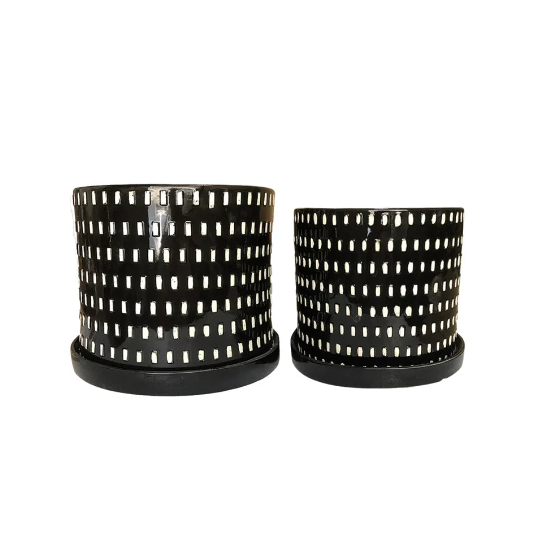 EXMT0050, MURREN MACETA CHICO maceta de cerámica en elegante color negro con un delicado diseño lineal grabado en tono blanco que aporta un toque sofisticado y moderno a cualquier espacio interior o exterior; su acabado suave y detalles finos resaltan la textura artesanal, ideal para realzar plantas naturales o decorativas, combinando funcionalidad y estilo sofisticado para ambientes contemporáneos y versátiles, MEDIDAS 25.4 x 25.4 x 21.79 cm, el color puede variar ligeramente de las fotografías