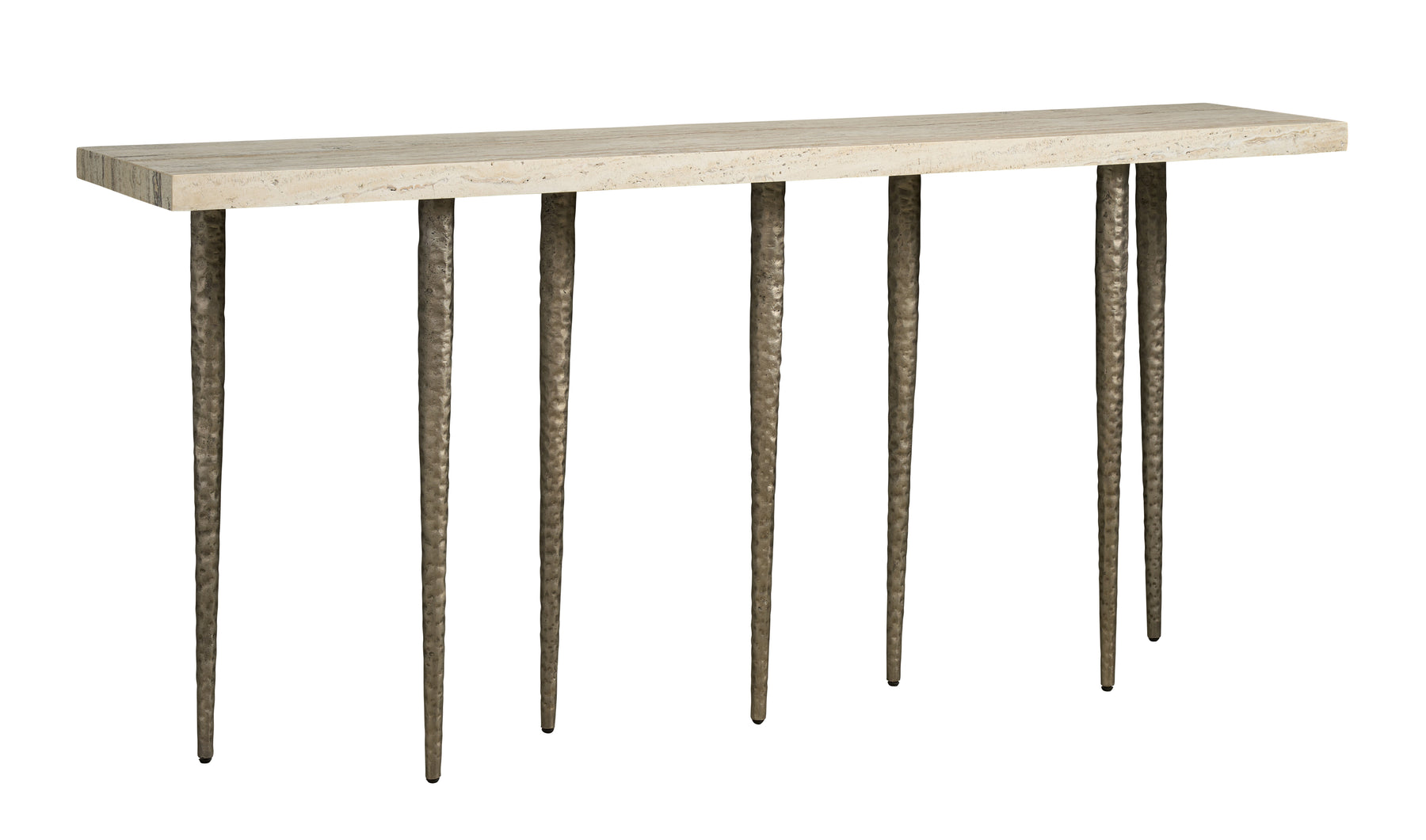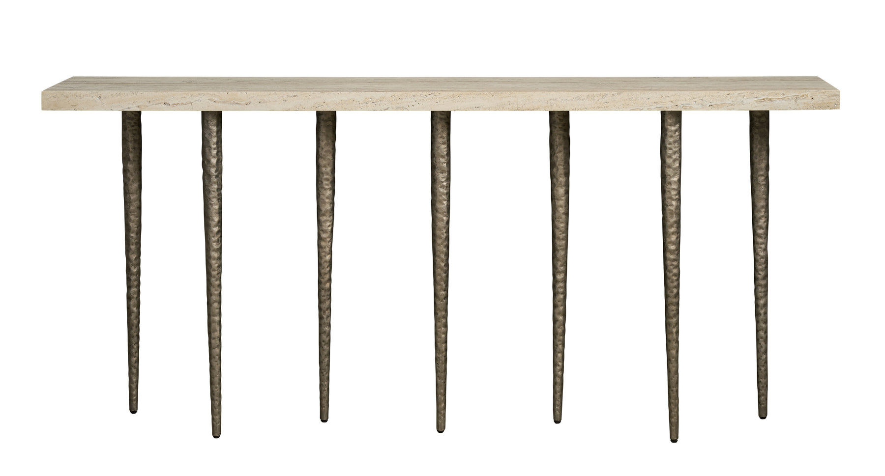 MACO0065, OLIVER, CONSOLA una consola de impacto escultural que combina la elegancia natural de la piedra con un diseño de base audaz y primitivo. La tapa es una losa rectangular de travertino natural (o piedra caliza), con un acabado pulido que contrasta con la base. Se sostiene sobre seis patas de metal forjado, cónicas y texturizadas (que recuerdan a estalactitas), con un acabado en bronce envejecido. Su diseño robusto y minimalista la convierte en una pieza central dramática para entradas, pasillos o salas de estar. MEDIDAS 182.88 x 35.56 x 86.36 cm, el color puede variar ligeramente de las fotografías.