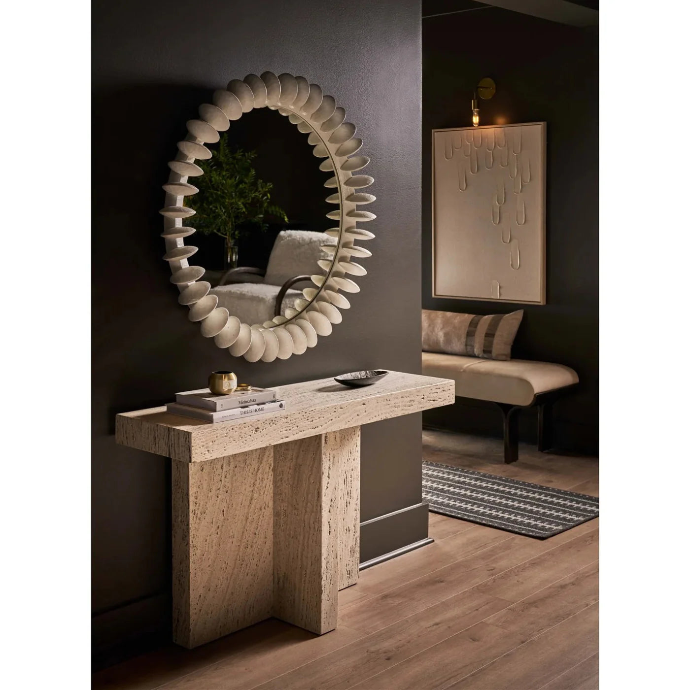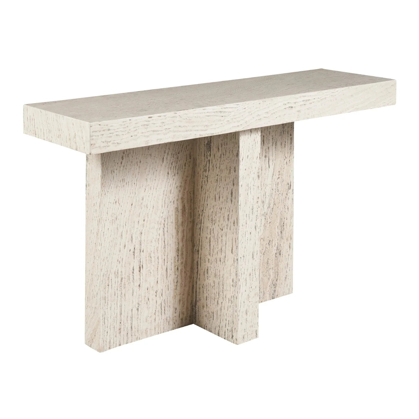 MACO0064, SANDRA CONSOLA minimalista y elegante con silueta en forma de T tallada íntegramente en travertino blanco, presenta líneas angulares y bordes definidos que aportan un carácter arquitectónico único, ideal para realzar espacios contemporáneos con un estilo limpio y sofisticado que transforma cualquier ambiente en un lugar distinguido y moderno, aportando funcionalidad y diseño en conjunto, MEDIDAS 121 x 35 x 76 cm, el color puede variar ligeramente de las fotografías