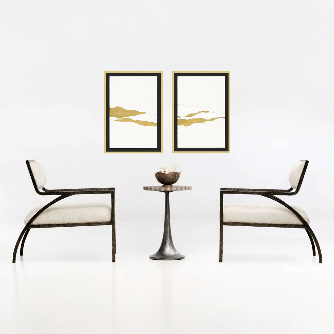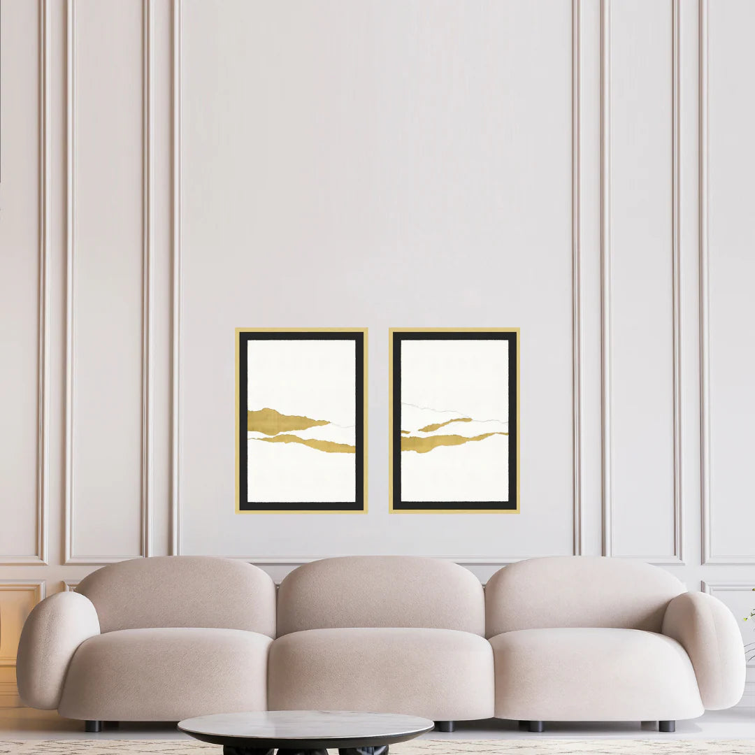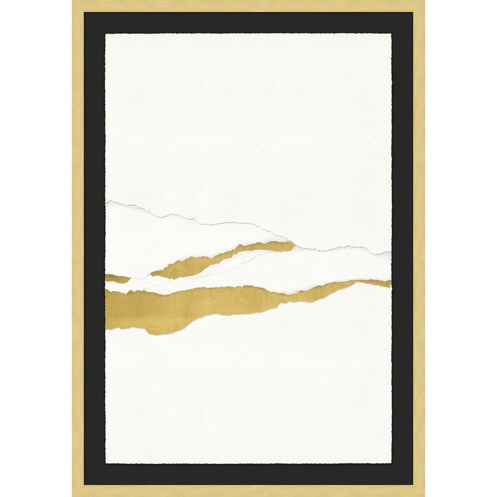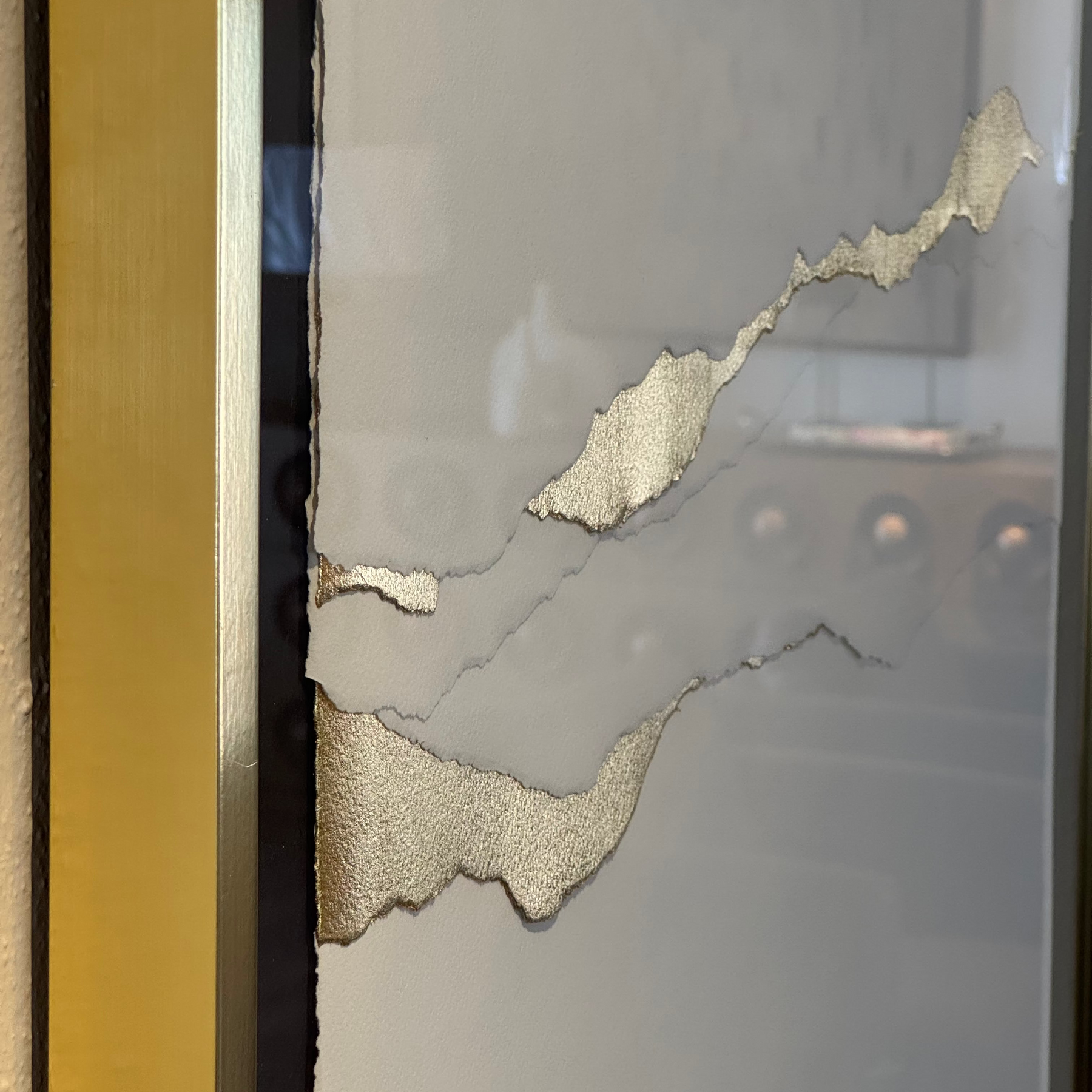 DPCU0396, EDEL II, CUADRO. Diseñada como la contraparte armónica perfecta, esta obra continúa la narrativa de textura y elegancia serena. La composición juega con la luz y la sombra a través de sus bordes irregulares de papel, creando una sensación de movimiento estático similar a estratos geológicos. El acento dorado central actúa como un hilo conductor de sofisticación, mientras que la caja de sombra (shadow box) con interior negro y perfil externo metálico otorga una profundidad dramática, ideal para vestíbulos o salones que requieren un equilibrio entre arte contemporáneo y acabados clásicos. MEDIDAS 74.93 x 5.40 x 105.41 cm, el color puede variar ligeramente de las fotografías.