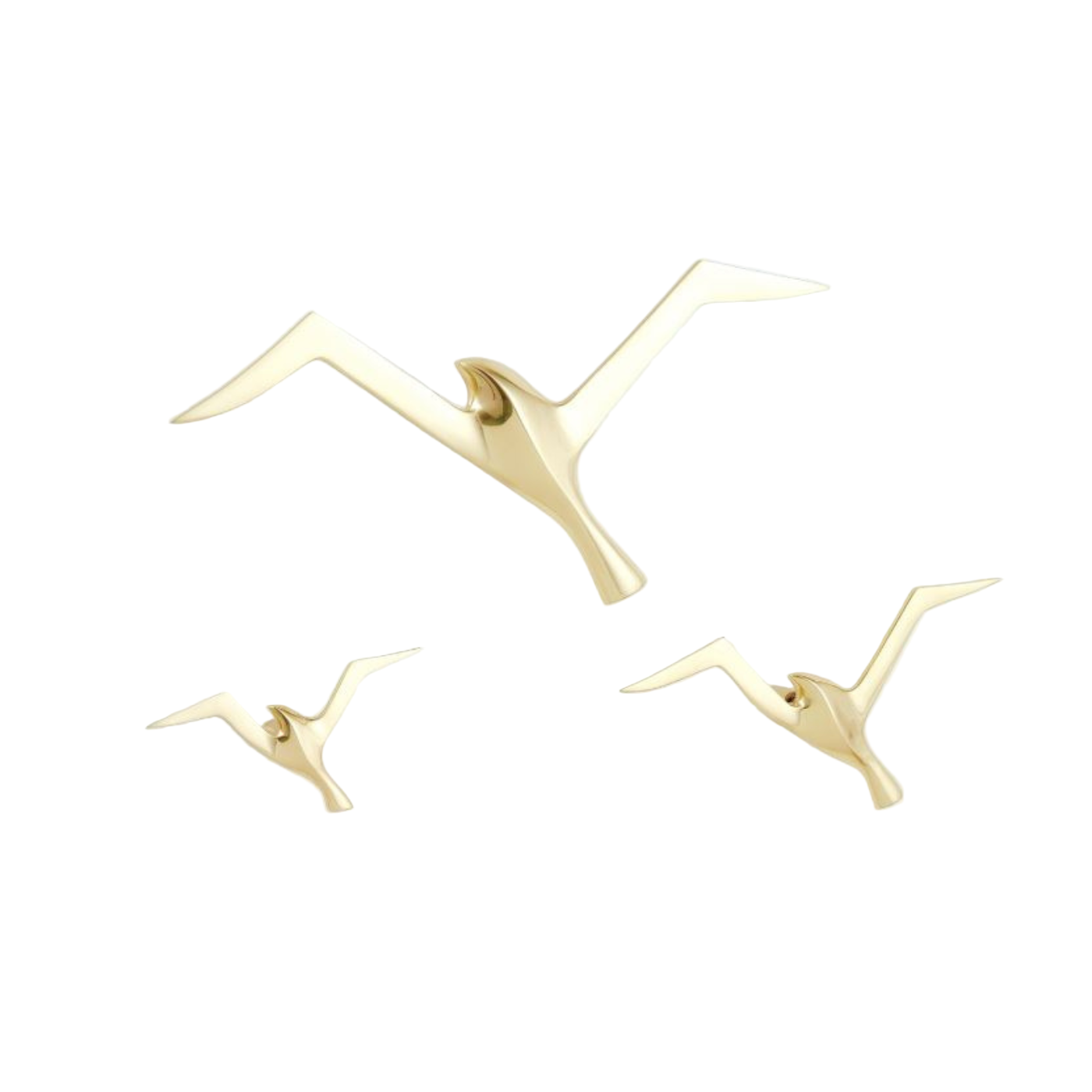 ADES0374, ESCULTURA PARED AVES DORADAS AVES II, conjunto decorativo de pared con efecto metálico en color dorado, incluye tres piezas en distintos tamaños que evocan aves en vuelo, ideales para crear composiciones dinámicas y elegantes sobre muros, MEDIDAS CHICO 13 X 3 X 8H CM, MEDIANO 20 X 5 X 15H CM, GRANDE 31 X 8 X 19H CM, el color puede variar ligeramente de las fotografías.