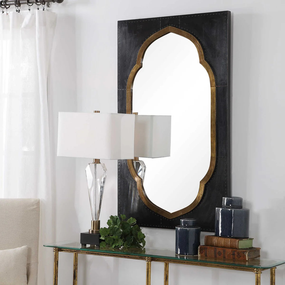 DPES0141, AINSA, ESPEJO MARCO NEGRO espejo marroquí con marco de madera maciza revestido en láminas de cobre que presenta un acabado en bronce oscuro con efecto ligeramente oxidado y un borde interior metálico dorado que aporta elegancia y sofisticación, ideal para colgar en orientación horizontal o vertical agregando un toque distinguido y contemporáneo a cualquier ambiente, MEDIDAS 71.12 x 5.08 x 121.92 cm, el color puede variar ligeramente de las fotografías