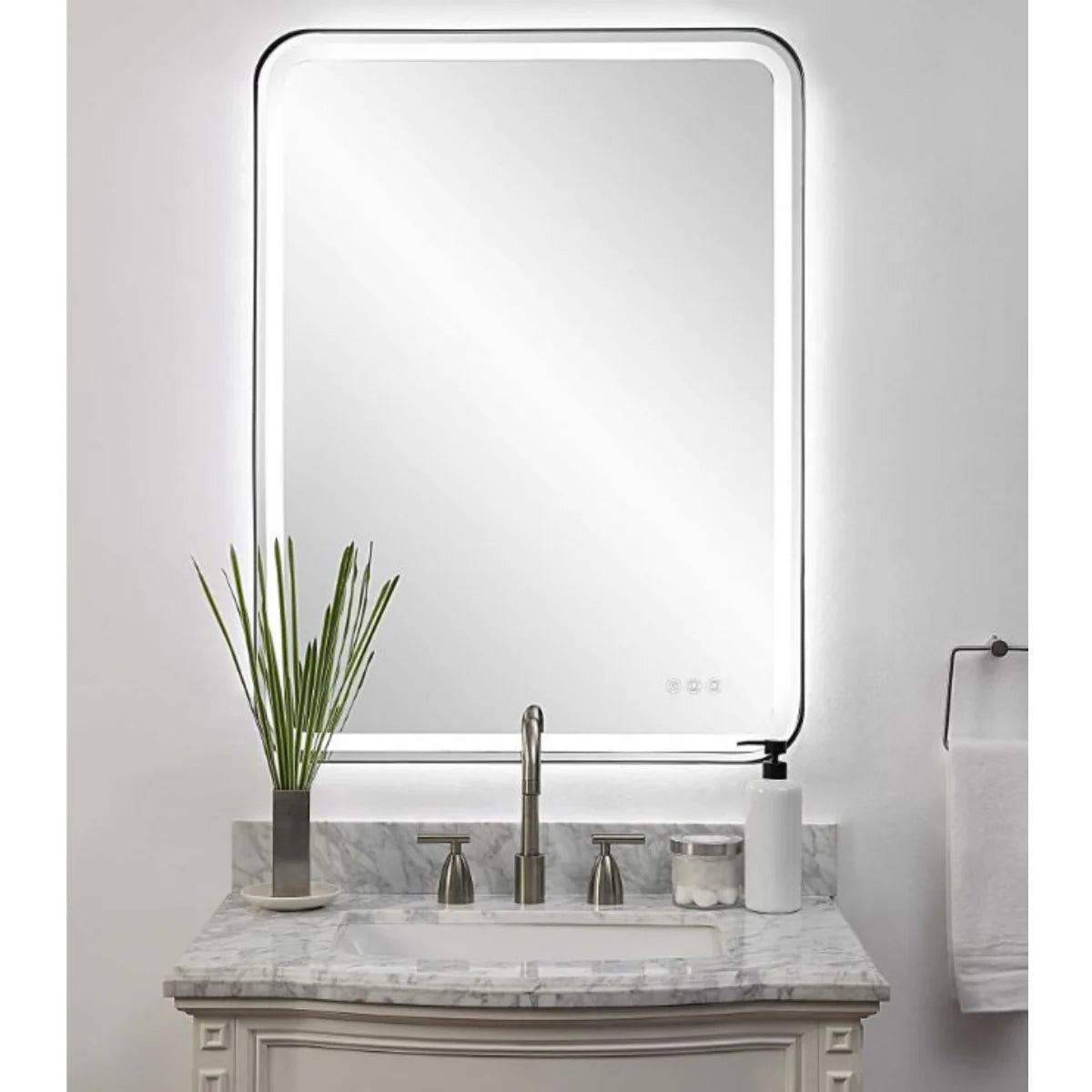 DPES0159, CIRASH ESPEJO CON LUZ espejo de diseño versátil que incorpora una suave iluminación LED integrada visible a través de una tira esmerilada en el vidrio con bordes pulidos para un acabado elegante y moderno, su marco de metal negro satinado ofrece resistencia y estilo sofisticado mientras se encuentra separado de la pared para generar una iluminación ambiental ambiental que realza cualquier espacio, ideal para ambientes contemporáneos que buscan funcionalidad y estética armoniosa MEDIDAS 76 x 5 x 101 cm, el color puede variar ligeramente de las fotografías