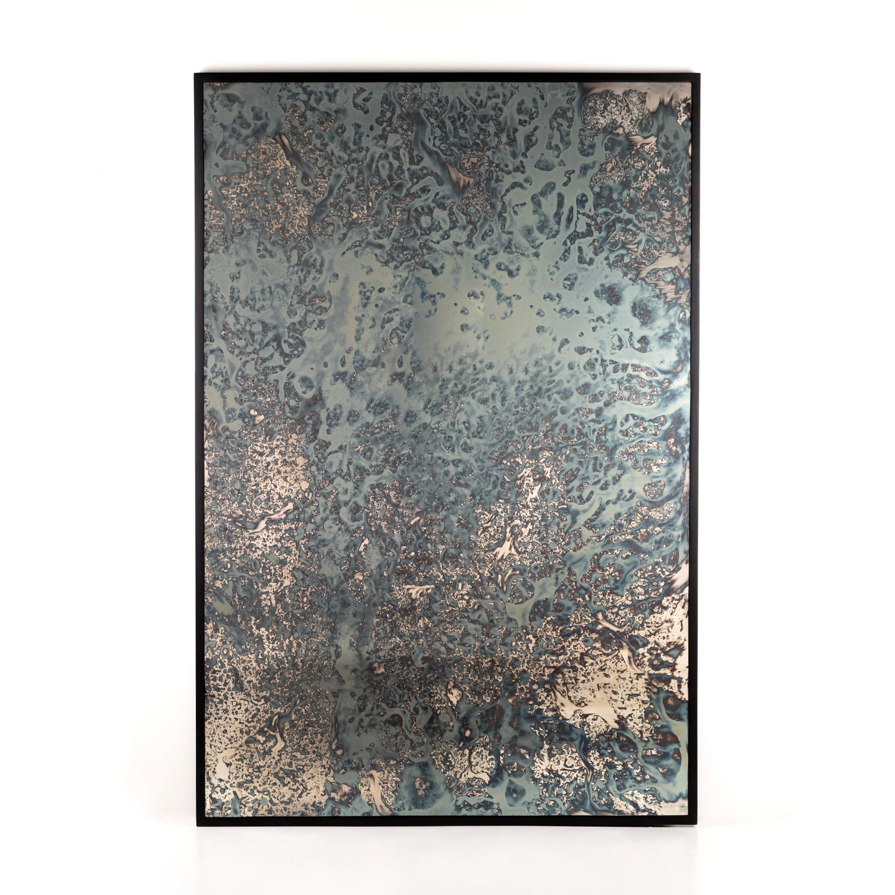 DPES0150, NARISA ESPEJO con marco rectangular de hierro negro que aporta un estilo contemporáneo y sobrio, equipado con espejo lavado con ácido y sutiles tonos azules pintados a mano que realzan su elegancia y aportan un detalle artístico único; ideal para decorar y ampliar visualmente cualquier espacio del hogar u oficina, combinando funcionalidad y diseño de alta calidad, MEDIDAS 137 x 3.81 x 205 cm, el color puede variar ligeramente de las fotografías