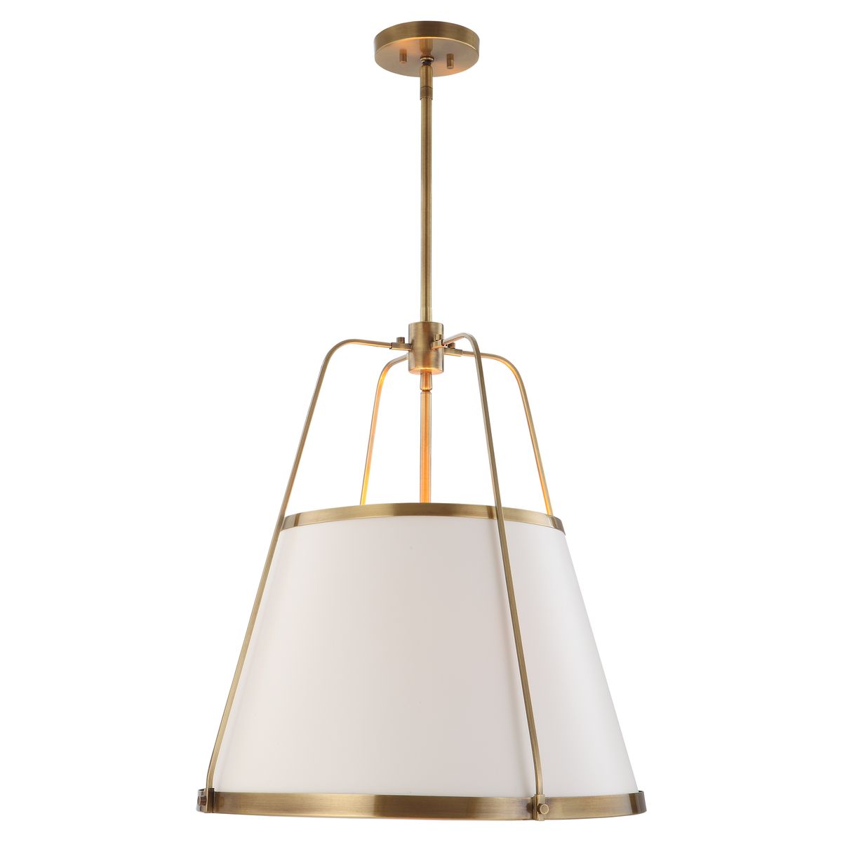 ILCA0144, BETHANY CANDIL mediano con ricas líneas clásicas y de transición que se fusionan en un diseño elegante y sofisticado, este colgante de 4 luces presenta un acabado en latón envejecido que aporta un toque vintage y una pantalla forrada en cuero blanco con una suave y rica tela blanca que brinda una iluminación cálida y acogedora ideal para realzar cualquier ambiente con estilo y distinción, MEDIDAS 63.5 x 63.5 x 68.5 cm, el color puede variar ligeramente de las fotografías