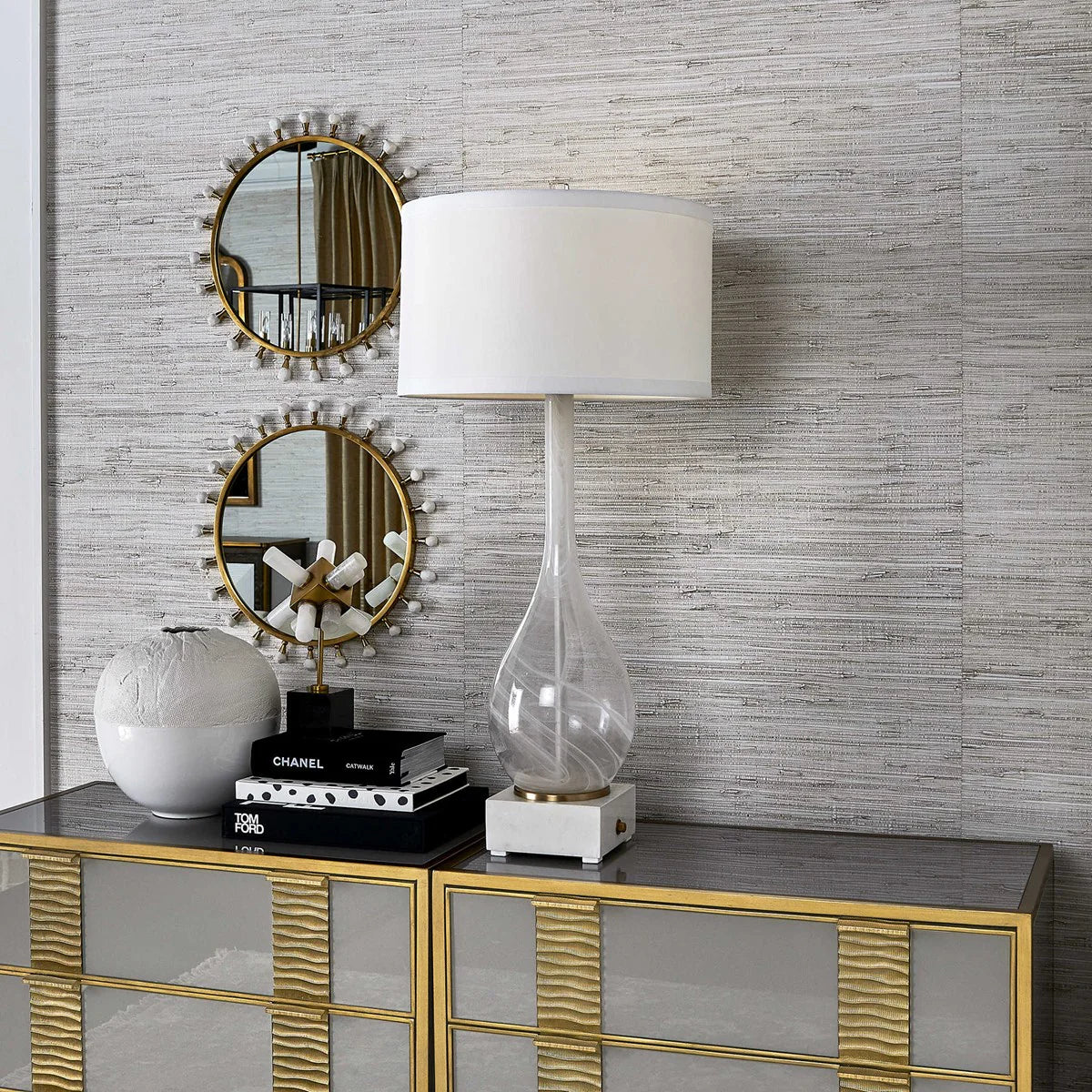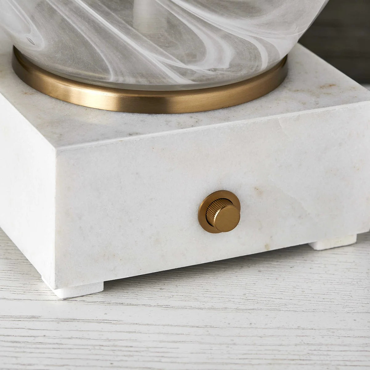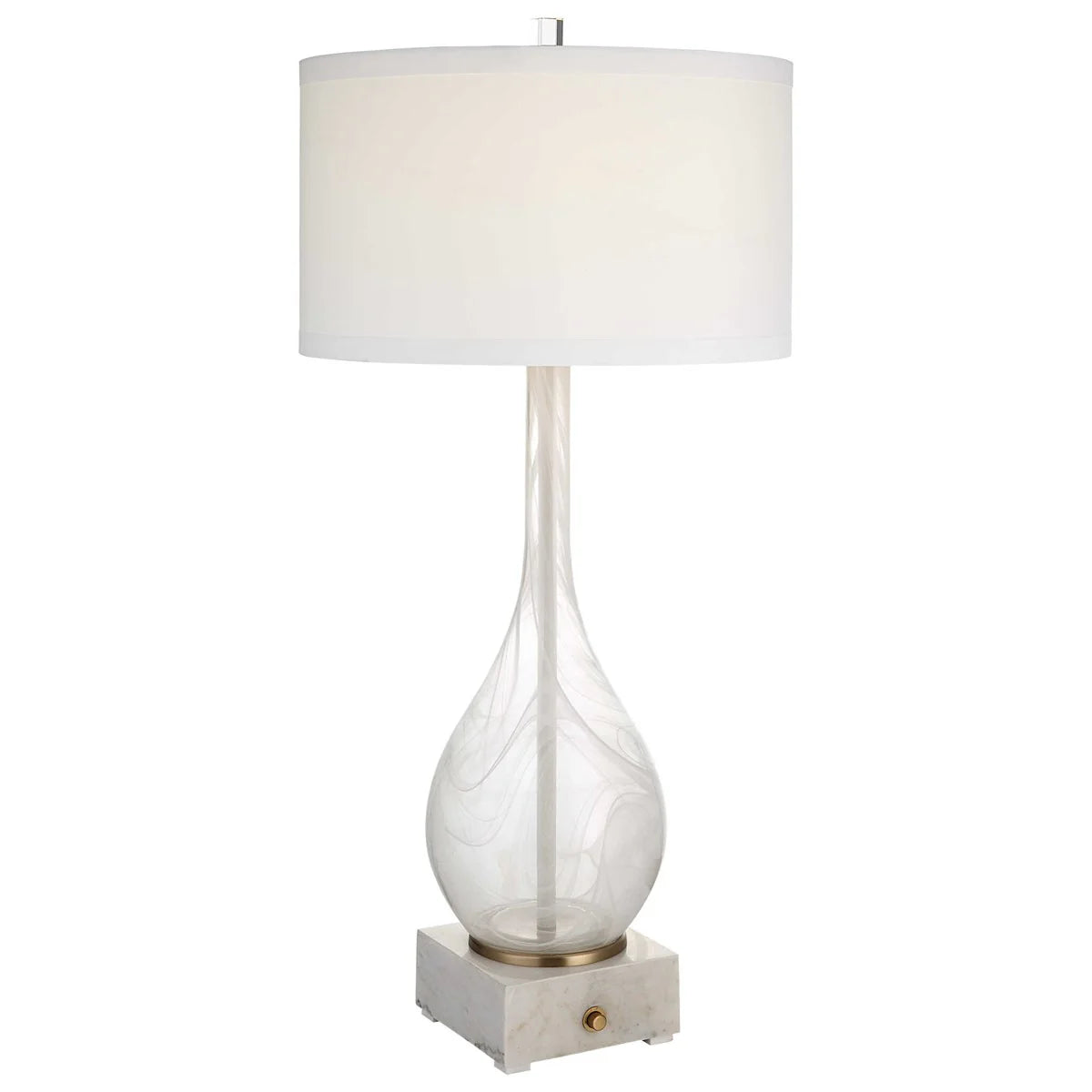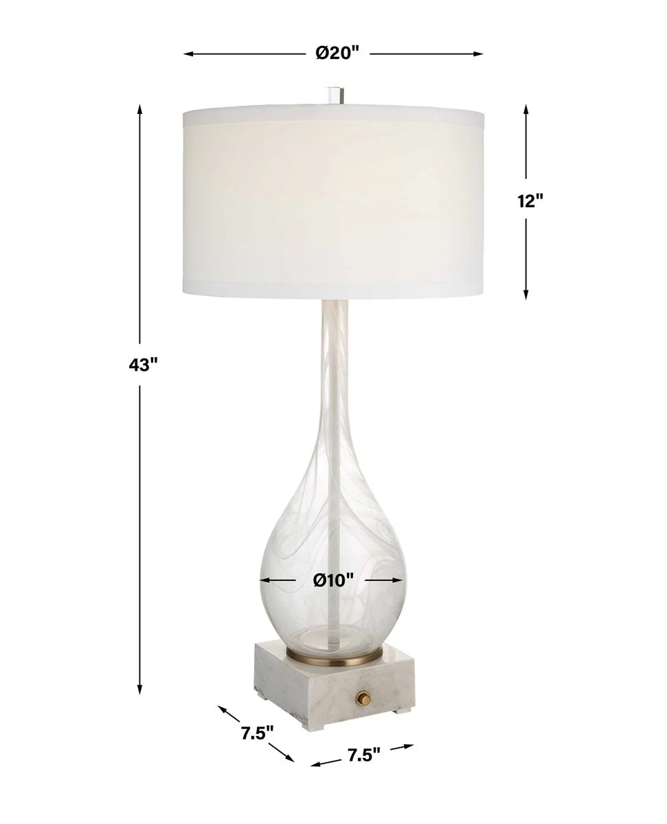 ILLM0214, BICHIYAL LÁMPARA DE MESA escultural lámpara hecha de vidrio soplado a mano en tonos transparente y blanco que combina elegancia y artesanía, cuenta con una base sólida de mármol blanco que sostiene un atenuador giratorio de latón para un control óptimo de la iluminación, su pantalla redonda de tapa dura está cubierta con tela blanca tipo seda shantung texturizada que aporta un acabado delicado y sofisticado ideal para cualquier ambiente moderno o clásico, MEDIDAS 50.8 x 30.48 x 109.22 cm, el color puede variar ligeramente de las fotografías