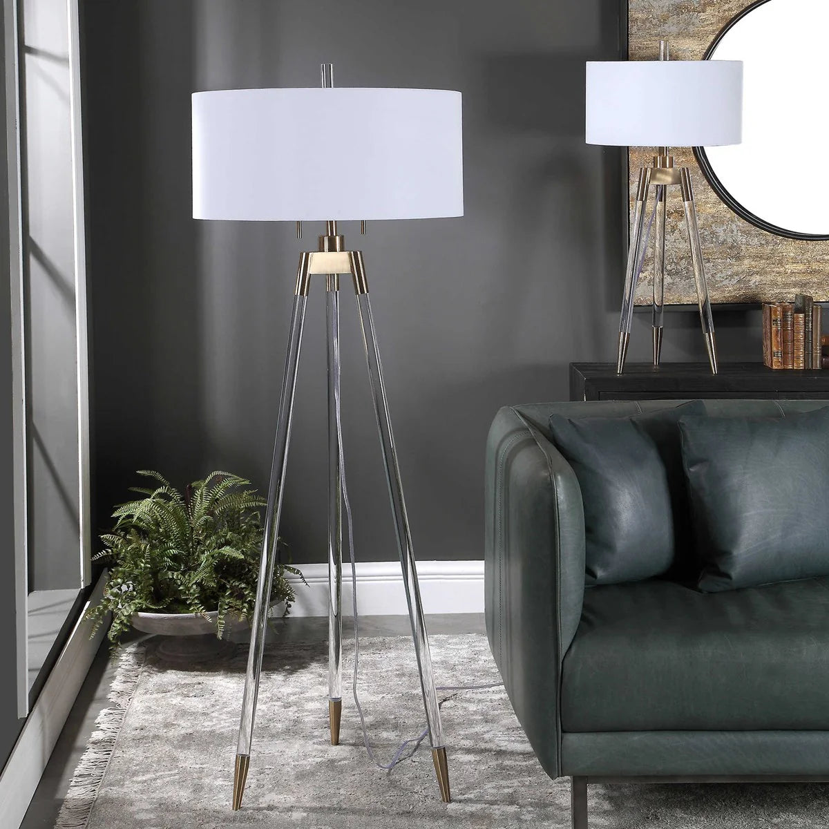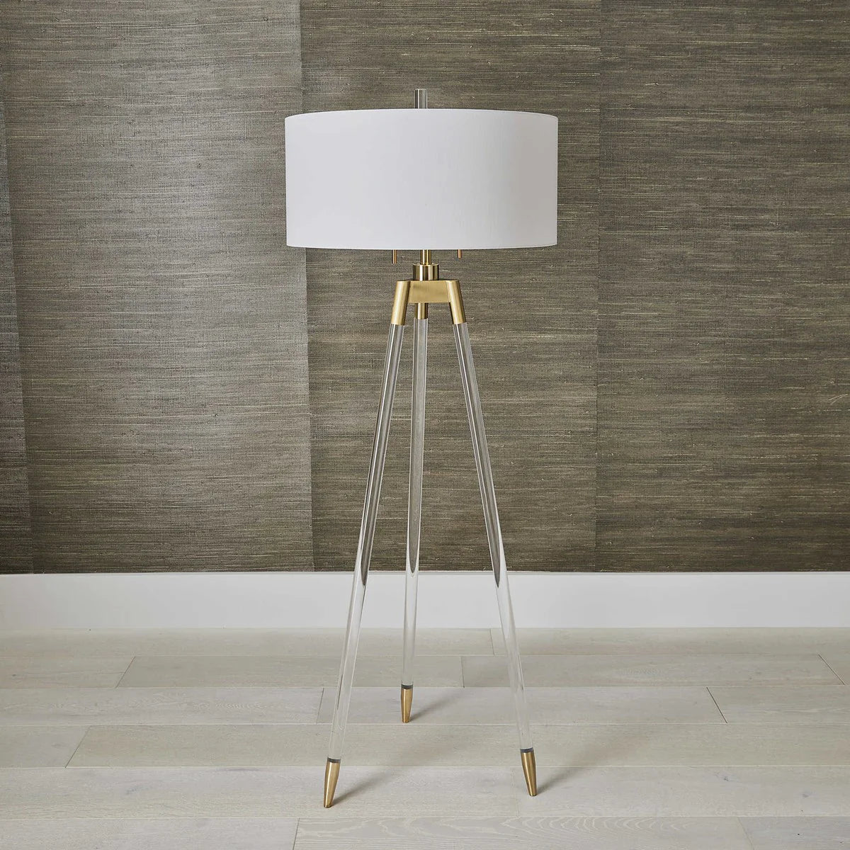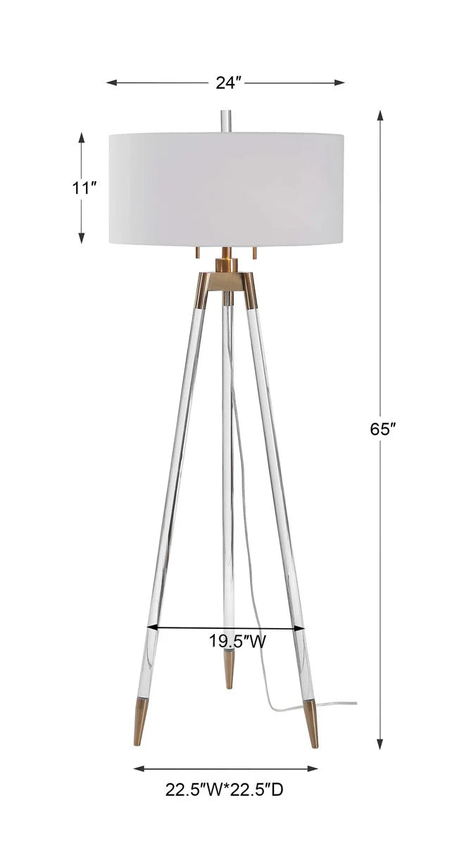 ILLP0036, CANTANDI LÁMPARA DE PIE diseño elegante de lámpara de pie estilo trípode que combina patas de acrílico transparente con tapas de pie enchapadas en latón cepillado y detalles a juego, complementada con una pantalla redonda dura en tejido de lino blanco que aporta un toque sofisticado y cálido a cualquier ambiente, ideal para realzar espacios contemporáneos y crear una atmósfera acogedora y luminosa, MEDIDAS 27.94 x 60.96 cm, el color puede variar ligeramente de las fotografías