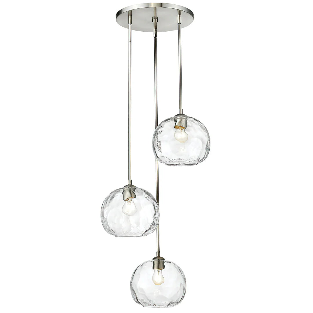 ILCA0151, CLOE CANDIL con diseño moderno y aerodinámico que aporta un toque contemporáneo a cualquier espacio, cuenta con tres luces con pantallas acanaladas y redondeadas de vidrio transparente con textura de agua que difunden una iluminación suave y elegante, suspendidas en un marco de acero con acabado en níquel cepillado que realza la sofisticación de comedores o áreas familiares, creando un ambiente acogedor y estilizado, MEDIDAS 50.8 x 50.8 x 76.2 cm, el color puede variar ligeramente de las fotografías.