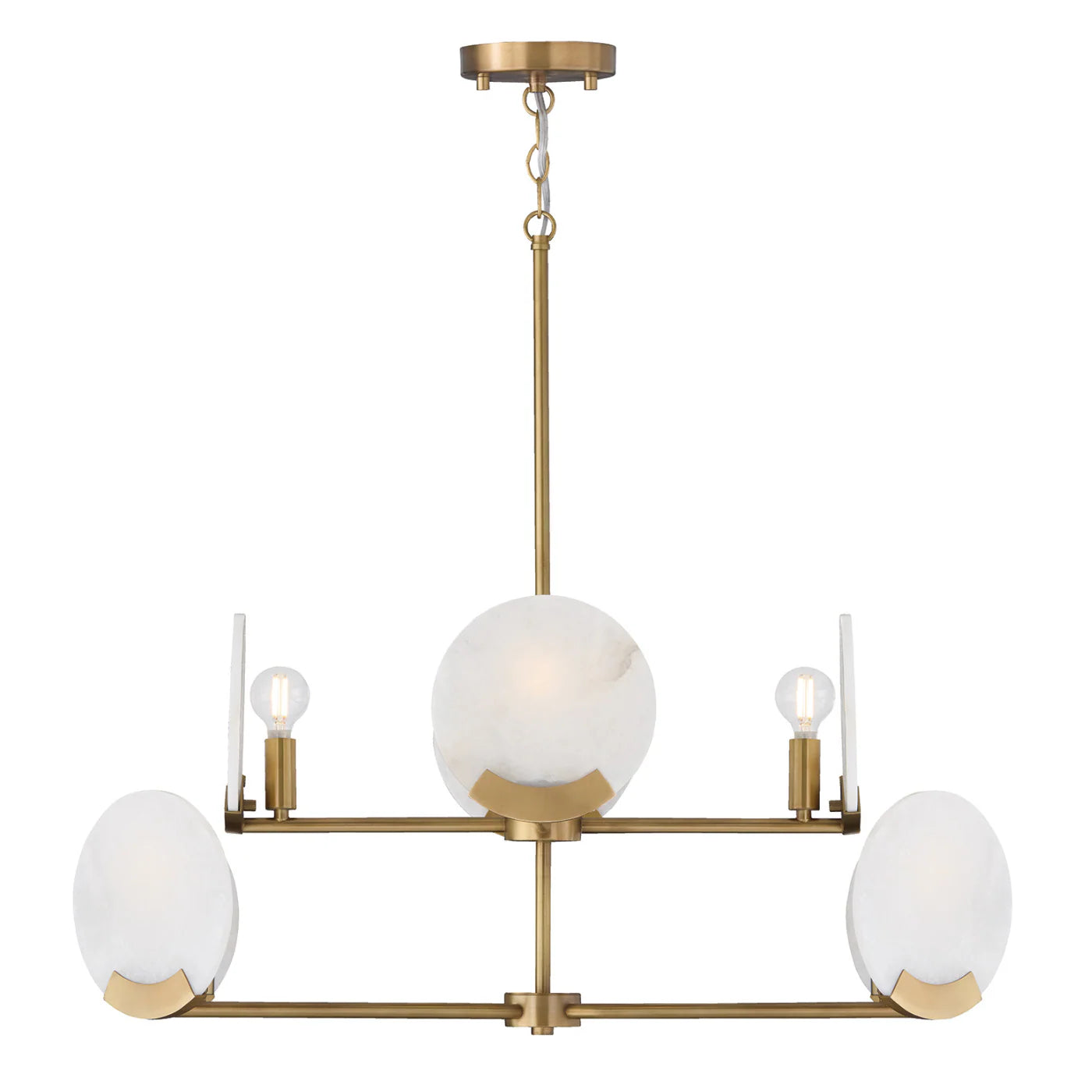 ILCA0190, CRISTOBAL CANDIL 8 L elaborado artesanalmente con piedra de alabastro natural que aporta una luz cálida y suave a cualquier ambiente, diseñado con dos niveles sujetos por una base curva que realza su sofisticación moderna y encanto natural, el acabado en latón envejecido ofrece detalles clásicos y elegantes ideales para espacios exclusivos, perfecto para crear atmósferas acogedoras y únicas en salones o comedores, MEDIDAS 88 x 88 x 35h cm, altura max 184 cm, el color puede variar ligeramente de las fotografías