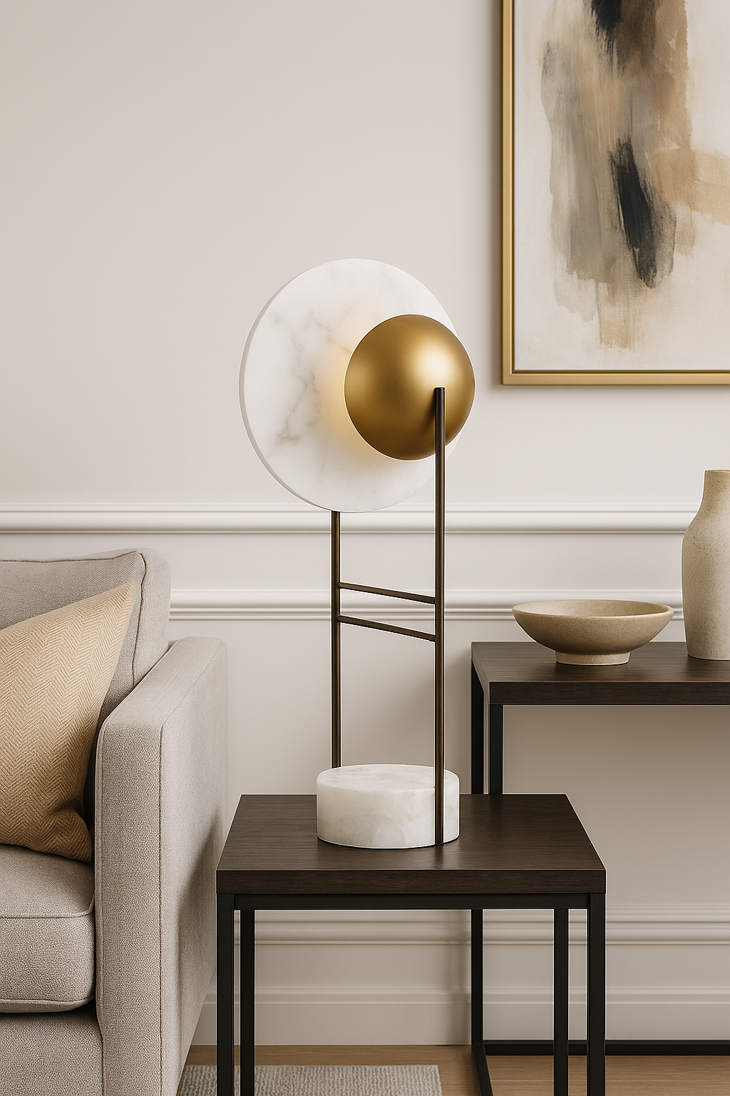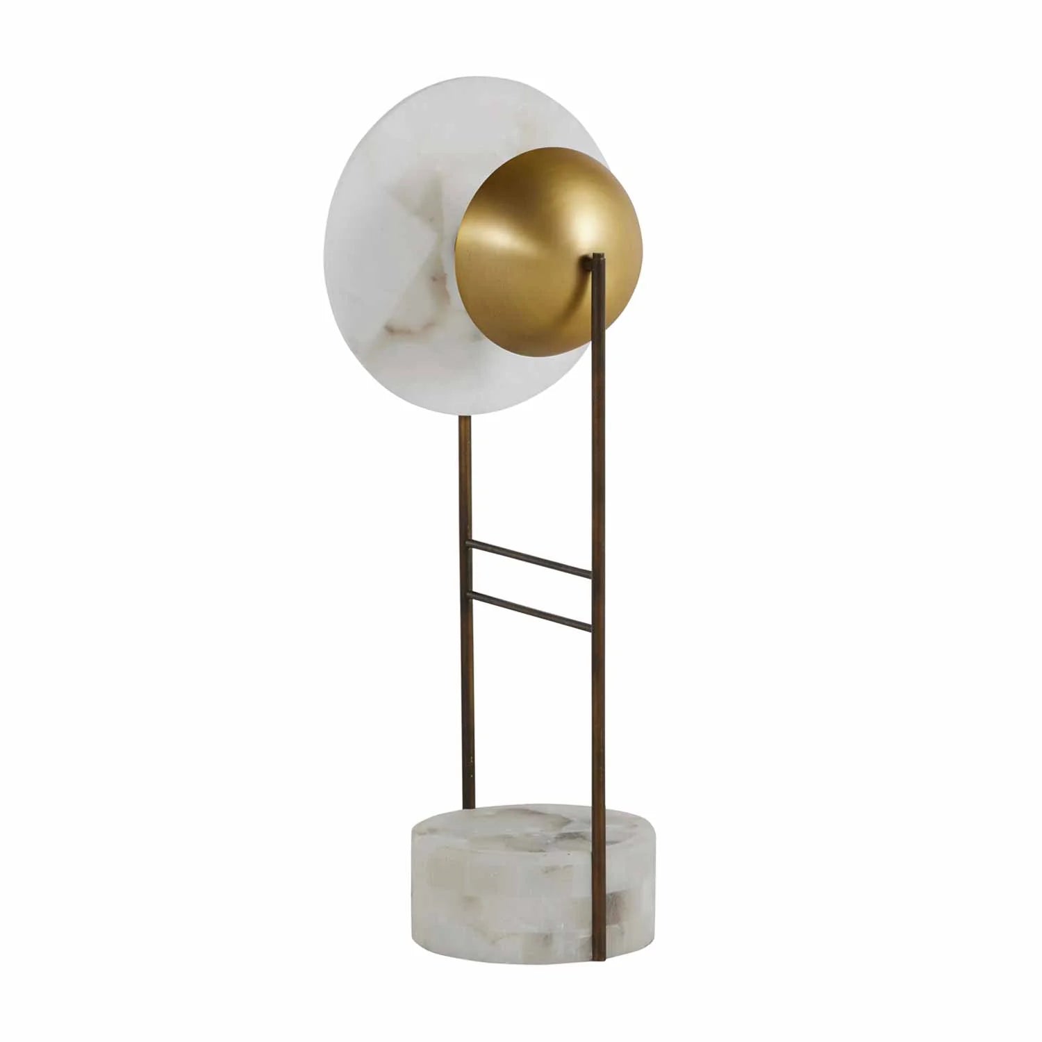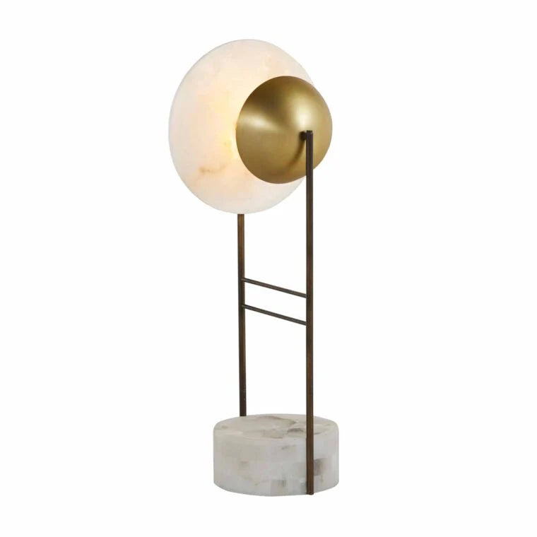 ILLM0234, FRAMEWORK LÁMPARA DE MESA con diseño moderno y elegante que combina líneas simples y curvas clásicas, su globo de alabastro natural emite un brillo cálido y acogedor ideal para crear ambientes agradables; su base apilada de alabastro aporta estabilidad y sofisticación, perfecta tanto para iluminar espacios de trabajo como para decorar con estilo cualquier habitación, MEDIDAS 33.02 x 23.87 x 78.74 cm, el color puede variar ligeramente de las fotografías