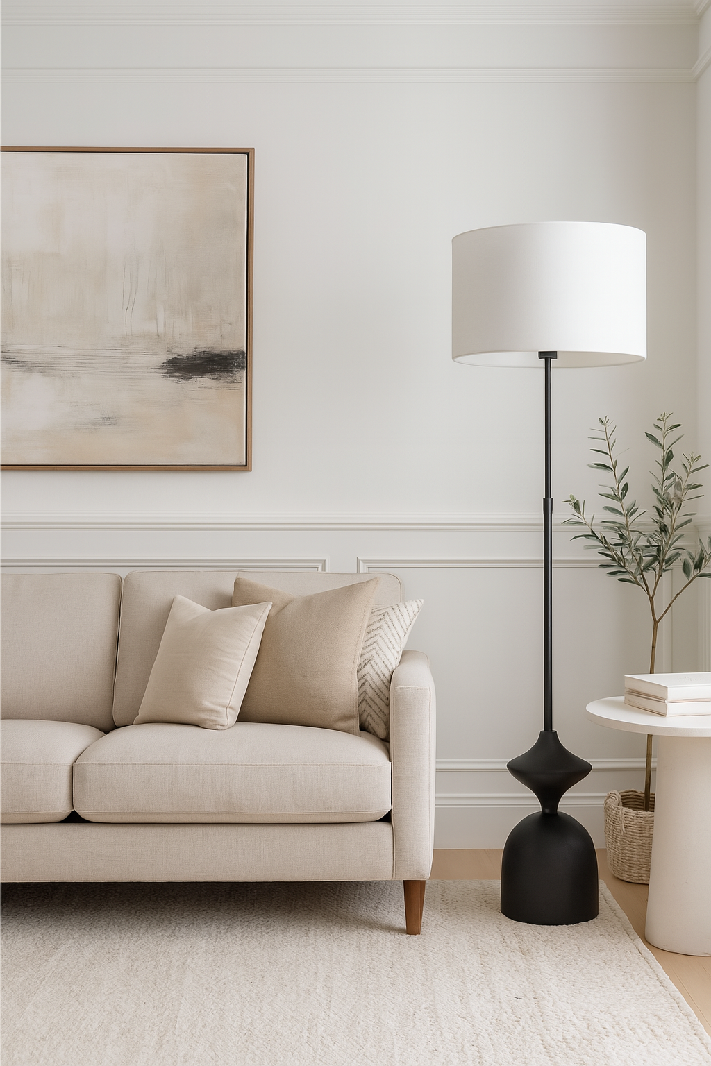 ILLP0039, HAITRAL LÁMPARA DE PIE una lámpara de pie con base de resina moldeada que ofrece una forma escultórica y única, combinando hierro y resina para aportar un ambiente artesanal y sofisticado que realza cualquier espacio interior; su pantalla de lino blanco proporciona un contraste nítido y elegante, ideal para iluminar con estilo salones o dormitorios, entregando una luz cálida y acogedora perfecta para ambientes modernos y contemporáneos, fácil de integrar en distintos estilos decorativos gracias a su diseño atemporal, MEDIDAS 50.8 x 50.8 x 180 cm el color puede variar ligeramente de las fotografías