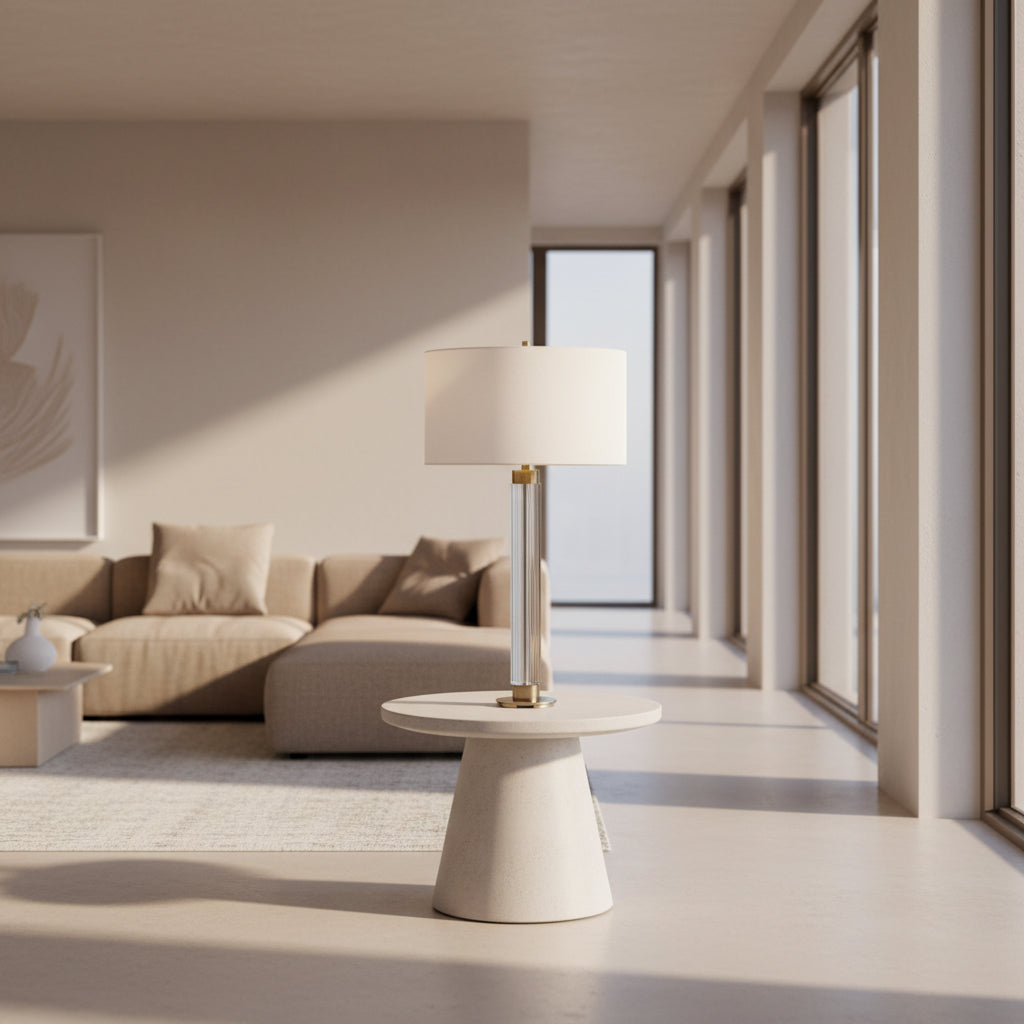 ILLM0194, PELLO LÁMPARA MESA de estilo contemporáneo con cristal tallado que aporta elegancia y sofisticación, líneas limpias y delicados detalles chapados en latón envejecido que resaltan su diseño exclusivo; la pantalla redonda de tapa dura revestida en lino blanco ofrece una luz suave y agradable ideal para ambientes modernos y cálidos, perfecta para decorar y dar funcionalidad en salas, oficinas o dormitorios, brindando un toque distintivo y acogedor; un objeto que combina calidad y estética para realzar cualquier espacio MEDIDAS 43.2 x 43.2 x 82.6 cm el color puede variar ligeramente de las fotografías
