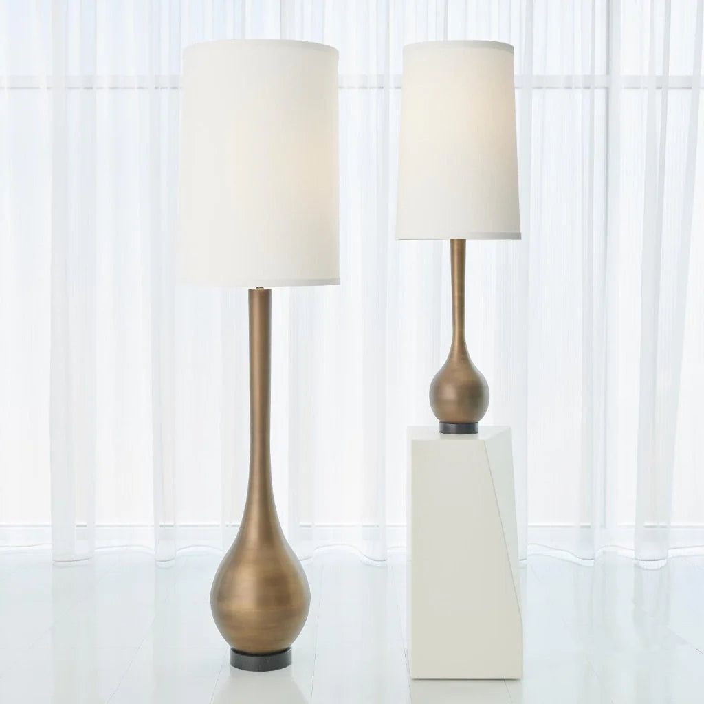 ILLM0188, TAU LAMPARA GOTA BRONCE lámpara de mesa con diseño elegante y silueta icónica, acabada en latón cepillado macizo que aporta un brillo sofisticado junto a su base de granito negro que garantiza estabilidad y estilo, equipada para bombilla "A" de 100W con cable plateado transparente de 8 pies e interruptor en el enchufe para uso cómodo, pantalla rígida de poliéster decorada con un delicado adorno de seda sintética color marfil que ofrece una luz suave y agradable perfecta para cualquier ambiente moderno o clásico, un elemento decorativo funcional y distinguido que realza cualquier espacio MEDIDAS 128.27 x 40.64 cm el color puede variar ligeramente de las fotografías