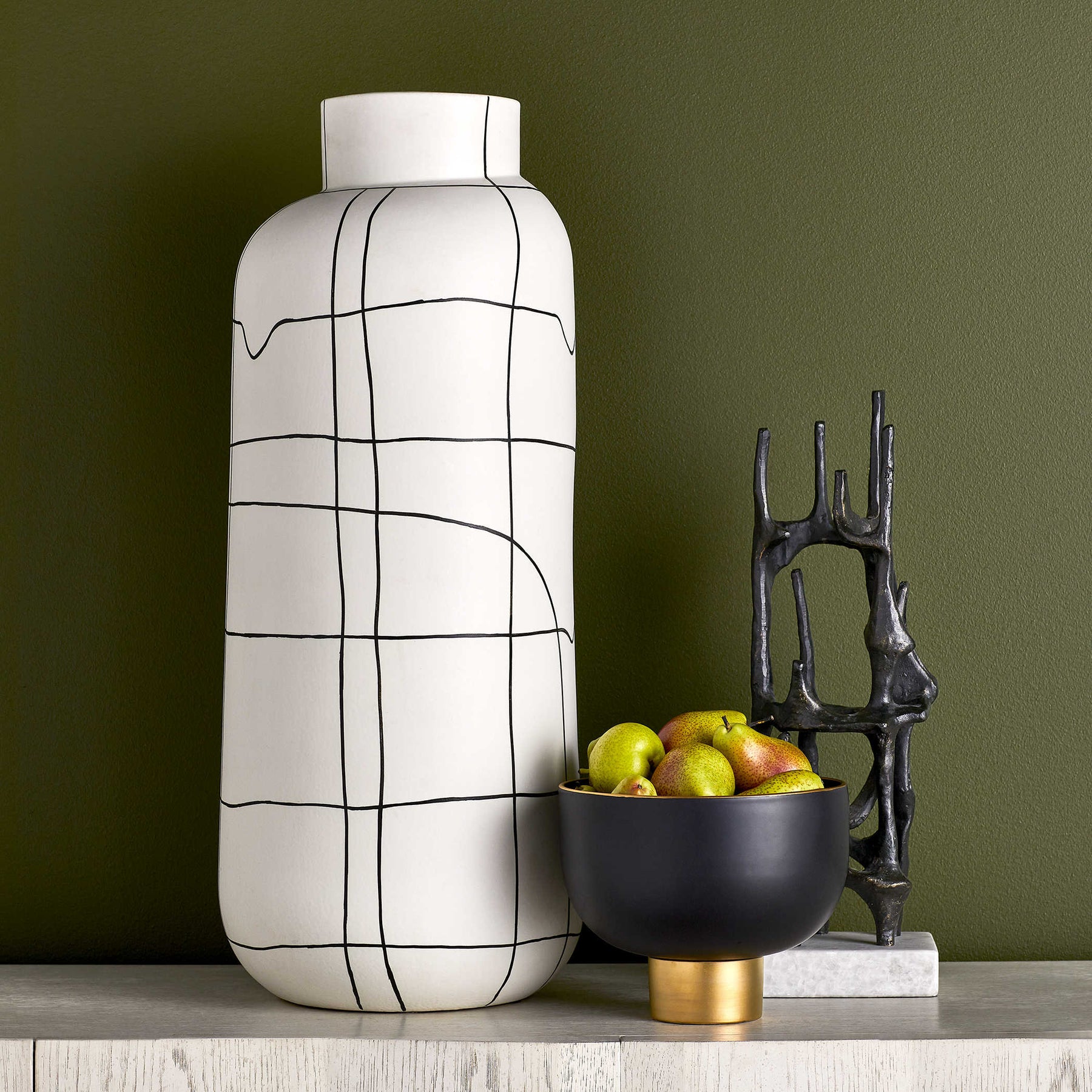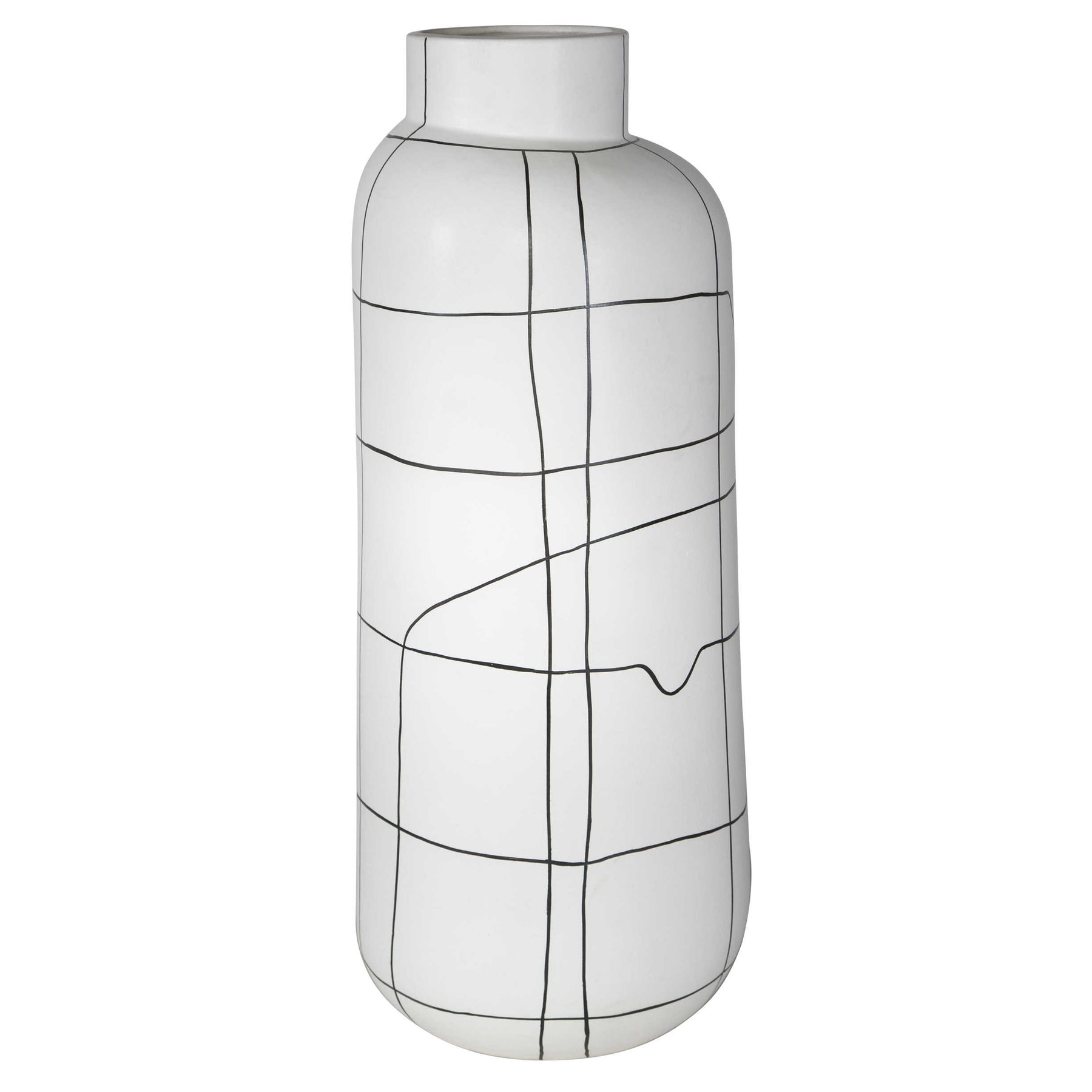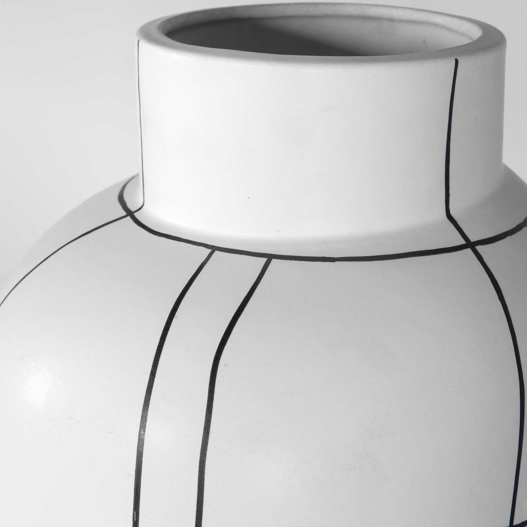 ADJR0446, ODETTE JARRON BLANCO Y NEGRO elaborado en cerámica de alta calidad, presenta un acabado de esmalte mate que realza su estilo contemporáneo con patrones en blanco y negro inspirados en mapas de calles urbanas, aportando un toque moderno y artístico a cualquier espacio, ideal para decorar interiores con elegancia y sofisticación, MEDIDAS 30.48 x 73.66 x 30.48 cm, el color puede variar ligeramente de las fotografías