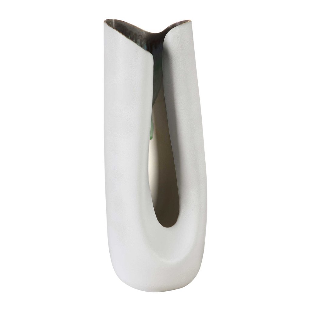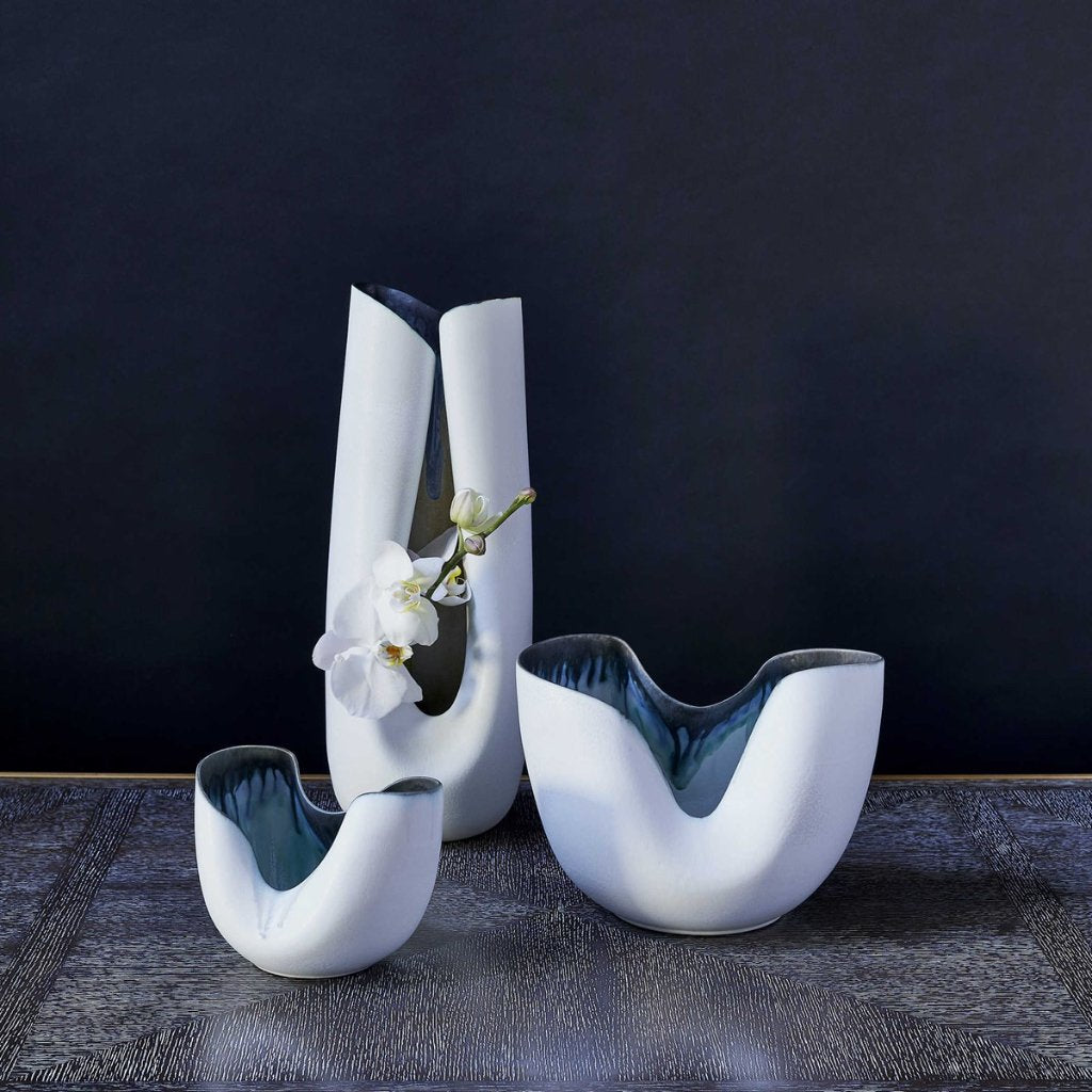 ADJR0320, JARRÓN ALTO ODIN, elaborado en porcelana de esmalte reactivo blanco de alta cocción con borde índigo y verde azulado profundo, pieza escultural decorada individualmente por artesanos, cada unidad es una declaración única de diseño y calidad, ideal para destacar en interiores sofisticados, MEDIDAS 17.78 X 17.78 X 48.26 CM, el color puede variar ligeramente de las fotografías.