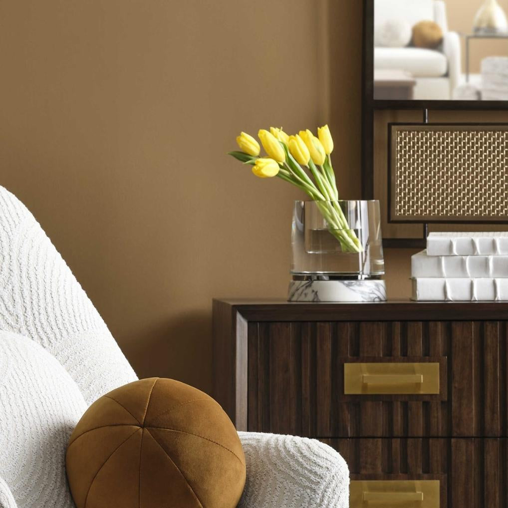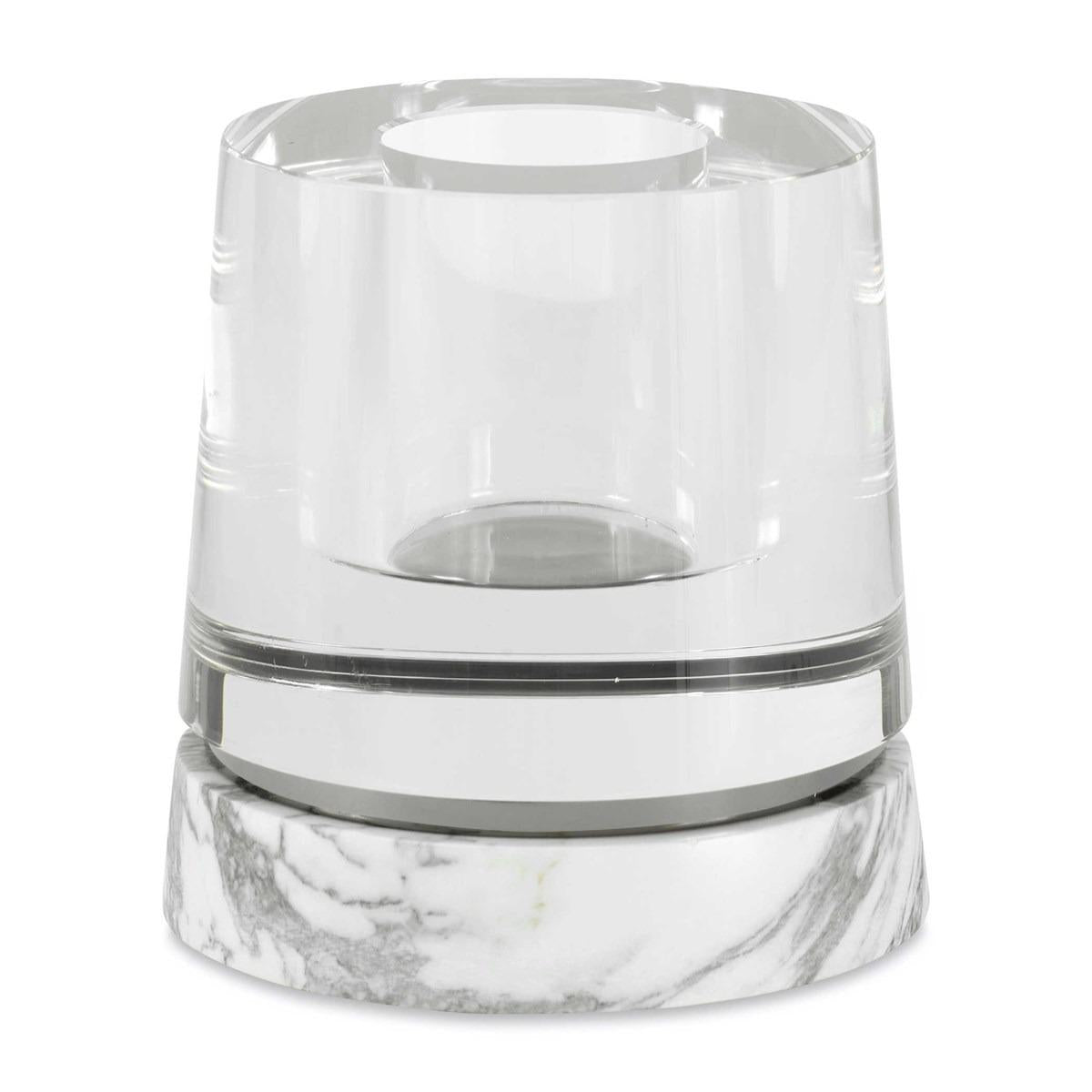 ADJR0457, OPTIC, JARRON es una pieza de acento de estética minimalista y construcción masiva, destacando por su impresionante densidad y peso (más de 10 kg) en un formato compacto. El diseño se compone de un cuerpo cilíndrico de cristal sólido de gran espesor y transparencia óptica, montado sobre una base circular de mármol blanco natural con vetas grises. La pureza de los materiales permite que la pieza capture y refracte la luz, funcionando tanto como un objeto decorativo escultural como un soporte funcional de gran estabilidad para arreglos florales bajos o iluminación. MEDIDAS 17.78 x 17.78 x 17.78 cm, el color puede variar ligeramente de las fotografías.