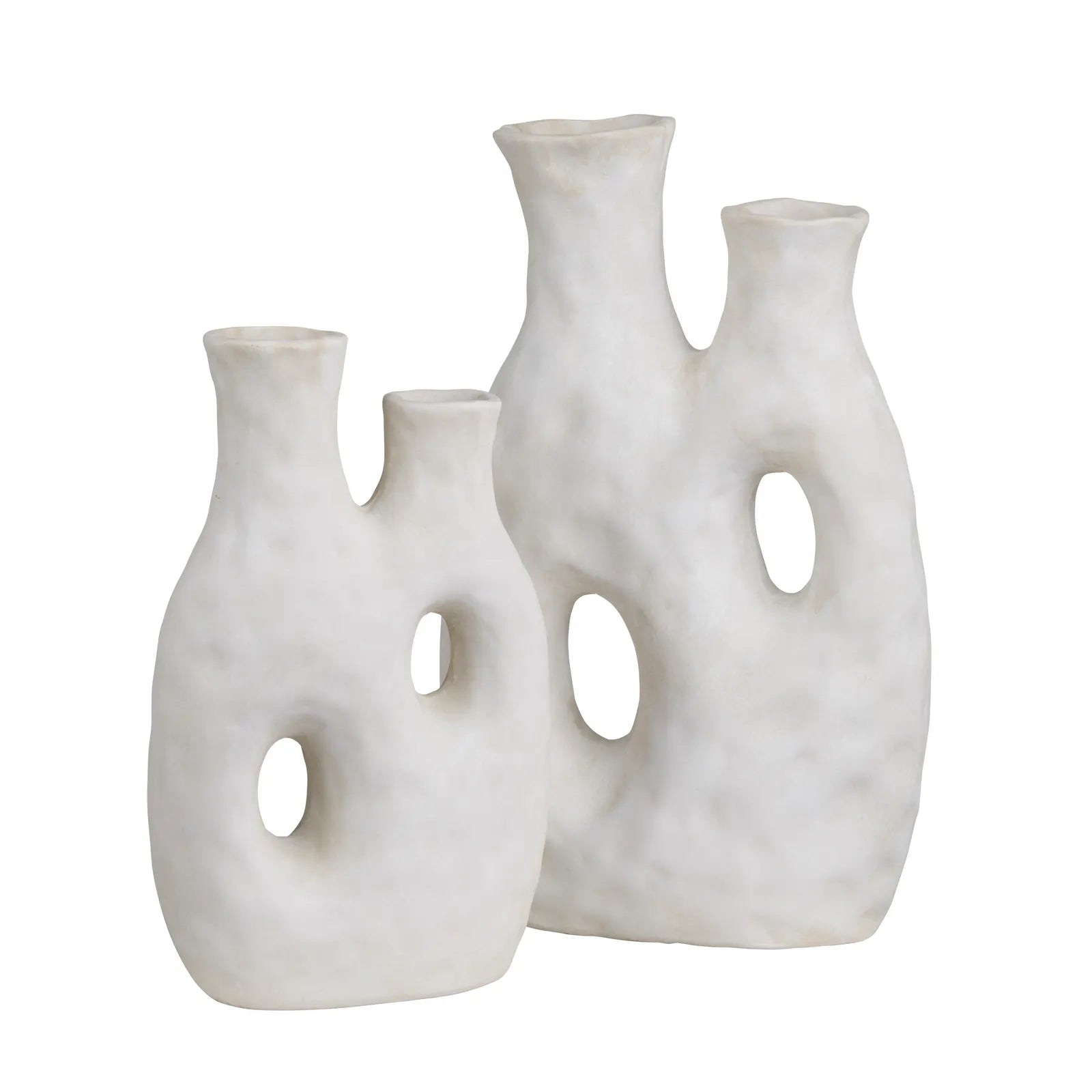 ADJR0474, REEVES, JARRON S/2 es un dúo de jarrones escultóricos que destacan por su diseño orgánico y abstracto. Fabricados en resina compuesta, presentan un acabado blanco mate con una textura sutilmente rugosa que emula la piedra caliza o el yeso artesanal. Su silueta única se caracteriza por formas fluidas e irregulares, destacando por tener "dobles cuellos" o bocas asimétricas y perforaciones (cutouts) ovaladas en el cuerpo que integran el espacio negativo en la composición. Son ideales para estilos modernos, nórdicos o wabi-sabi. MEDIDAS 27.94 x 11.43 x 49.53 cm (Grande) y 24.13 x 10.16 x 36.83 cm (Chico), el color puede variar ligeramente de las fotografías.