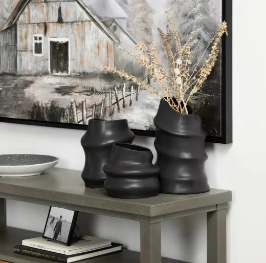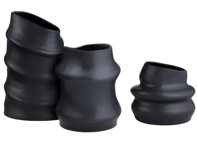 ADJR0478, WILLY JARRON SET 3 NEGRO set de tres jarrones cilíndricos de diseño irregular en acabado mate que combina textura y sobriedad, con siluetas asimétricas que aportan profundidad visual y un carácter contemporáneo, ideales para crear composiciones dinámicas y dar estilo a espacios modernos con un toque elegante y sofisticado, MEDIDAS 20.32 x 20.32 x 32.39 cm, 28.00 x 28.00 x 42.00 cm, 68.00 x 28.00 x 42.00 cm, el color puede variar ligeramente de las fotografías