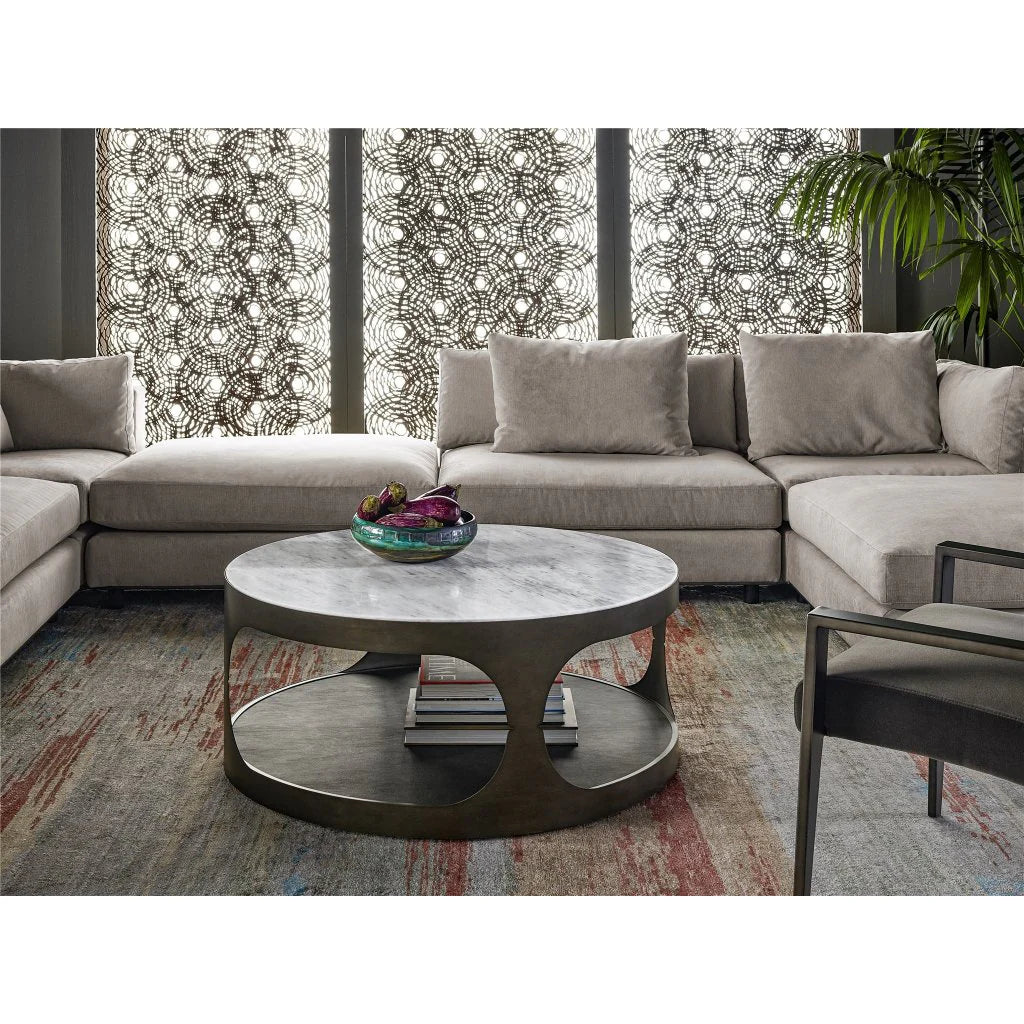 MAMC0151, TISZA MESA DE CENTRO redonda con un diseño único que incorpora un espacio central para almacenamiento visible, su superficie lisa de piedra aporta elegancia y sofisticación mientras que el estante inferior recubierto en piel sintética ofrece un toque de textura y calidez, todo complementado con ruedas que facilitan su movilidad, ideal para ambientar salas con estilo y funcionalidad moderna, MEDIDAS 101.16 x 101.16 x 43.18 cm, el color puede variar ligeramente de las fotografías