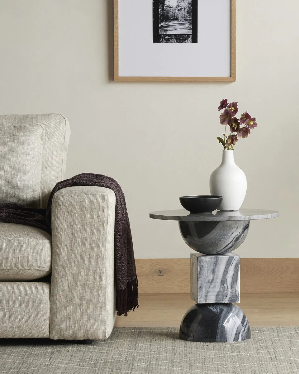 MAML0276, FARRAH MESA LATERAL MÁRMOL una elegante mesa auxiliar que combina mármol pulido en un diseño sofisticado inspirado en el estilo Deco, presentando una estructura con formas de semicírculos y cuadrados que aportan un toque artístico y distintivo a cualquier espacio, ideal para realzar ambientes con un aire de los años ochenta y un acabado lujoso que resalta la belleza natural del mármol, perfecta para complementar salas, recámaras o zonas de lectura con un detalle funcional y decorativo, MEDIDAS 46 x 46 x 47 cm, el color puede variar ligeramente de las fotografías
