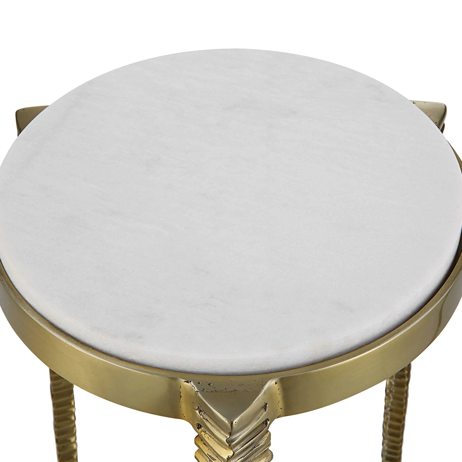 MAML0266, MAVIS MESA LATERAL chico con tapa de mármol blanco pulido natural que aporta un toque de elegancia y sofisticación, cuenta con patas cónicas en hierro fundido sólido con acabado en oro cepillado que brindan estabilidad y estilo distintivo; ideal para colocar su cóctel favorito o accesorios decorativos, complementa cualquier espacio con un diseño moderno y funcional, MEDIDAS 25.4 x 55.88 cm, el color puede variar ligeramente de las fotografías