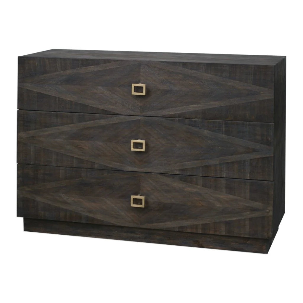 MAMO0142, MAVERICK MUEBLE OCASIONAL envuelta en chapa de acacia, esta cómoda de tres cajones ofrece un diseño espectacular con un frente decorado con dibujos de diamantes y un acabado en nogal ahumado que aporta calidez y sofisticación a cualquier espacio, complementada con tiradores cuadrados personalizados de latón cepillado macizo que realzan su elegancia y funcionalidad, ideal para darle un toque distintivo y moderno a su sala o dormitorio, combinando calidad y estilo con detalles artesanales únicos, MEDIDAS 121.92 x 40.64 x 86.36 cm, el color puede variar ligeramente de las fotografías