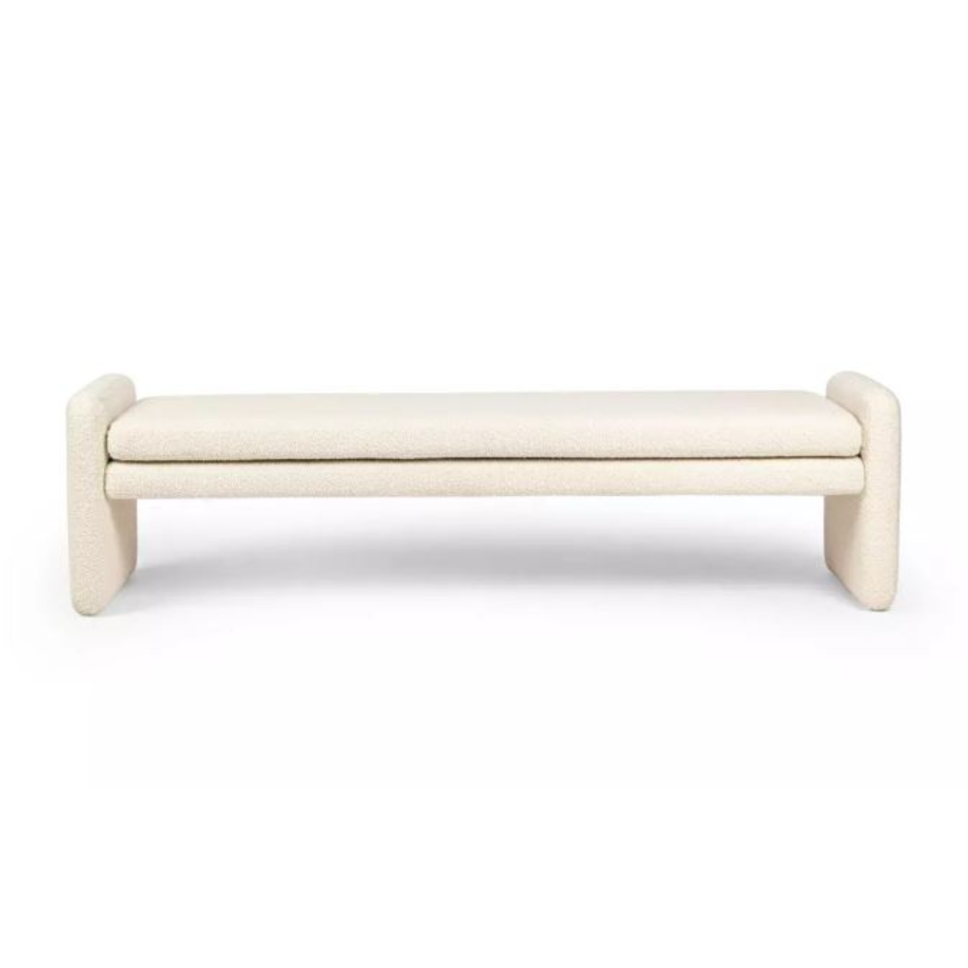 UPBA0069, PILAR BANCA tapizada en un elegante y suave tejido color crema con efecto bouclé que aporta una textura delicada y sofisticada, ideal para complementar cualquier espacio con un toque moderno y confortable, perfecta para ambientes que buscan un mueble funcional y decorativo que invite al descanso y la charla, MEDIDAS 177 x 45 x 48 cm, el color puede variar ligeramente de las fotografías