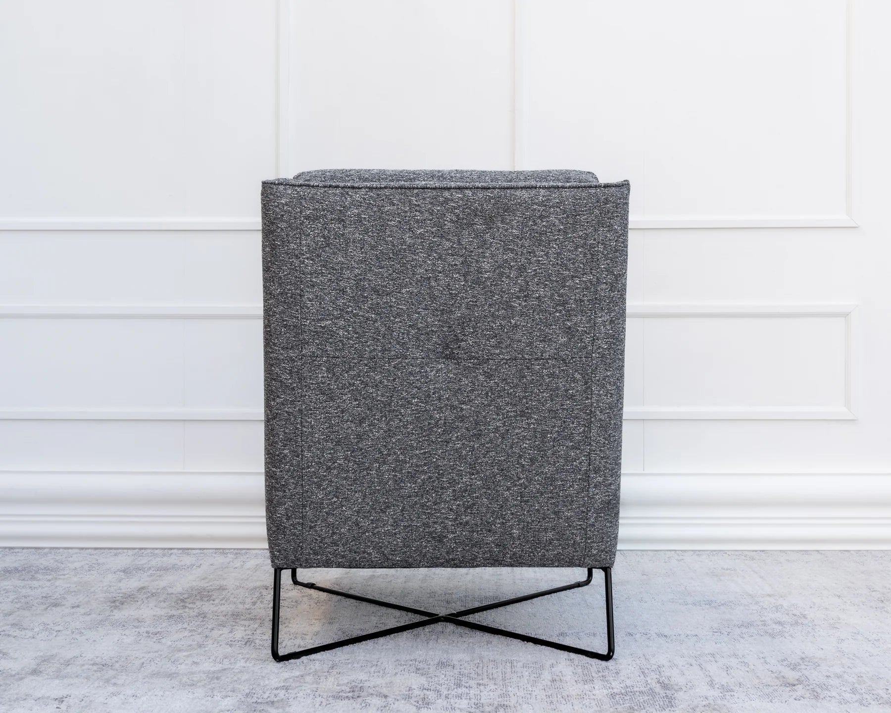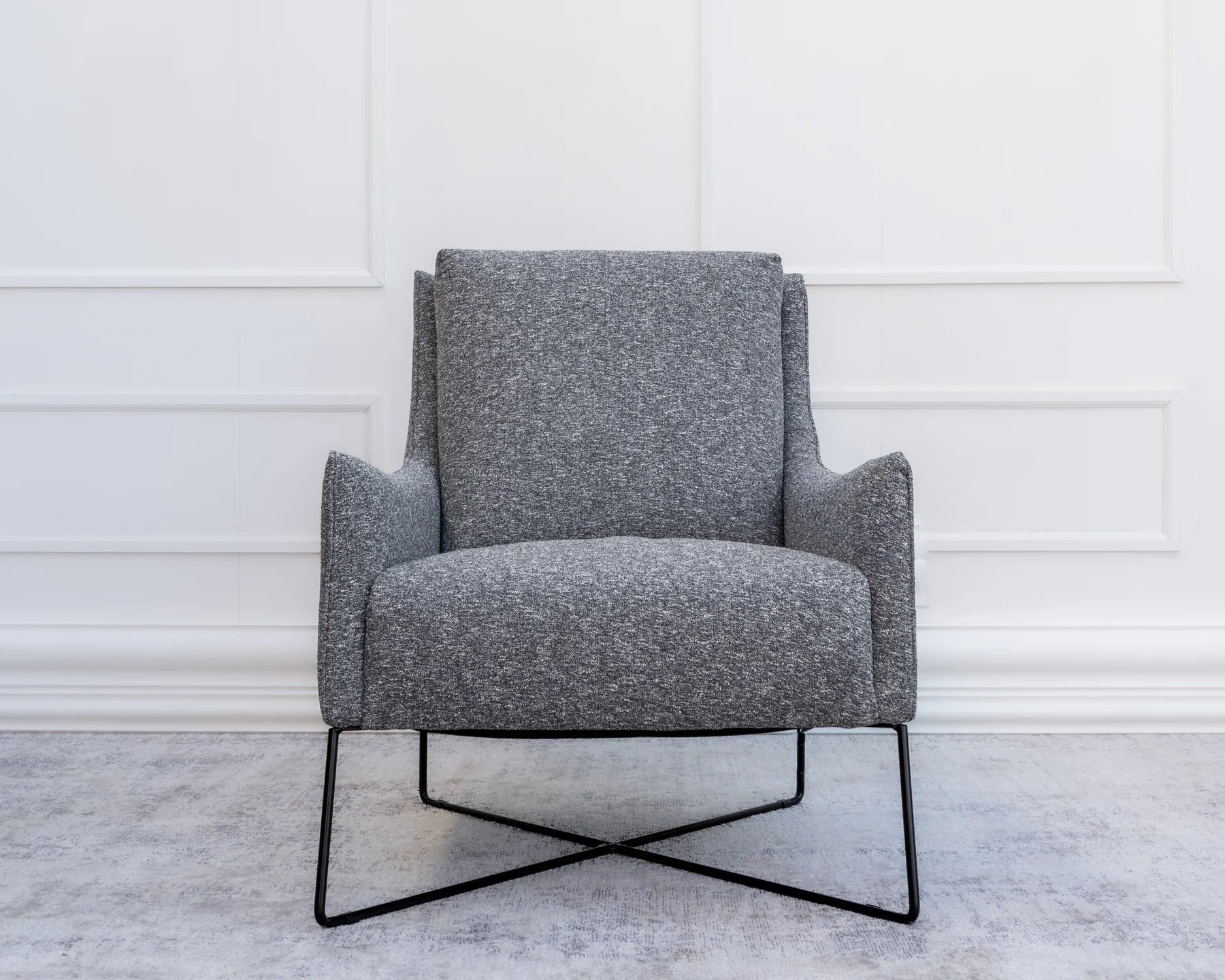 UPSO0292, REGINA SILLON INDIVIDUAL chico diseño exclusivo que ofrece un auténtico oasis de relax gracias a su elaboración artesanal italiana que combina elegancia y comodidad, tapizado en una tela gris sal y pimienta con textura cálida al tacto, complementado con patas delgadas cruzadas en negro mate que aportan un estilo contemporáneo y sofisticado ideal para diversos ambientes, MEDIDAS 69 x 89 x 84 cm, el color puede variar ligeramente de las fotografías
